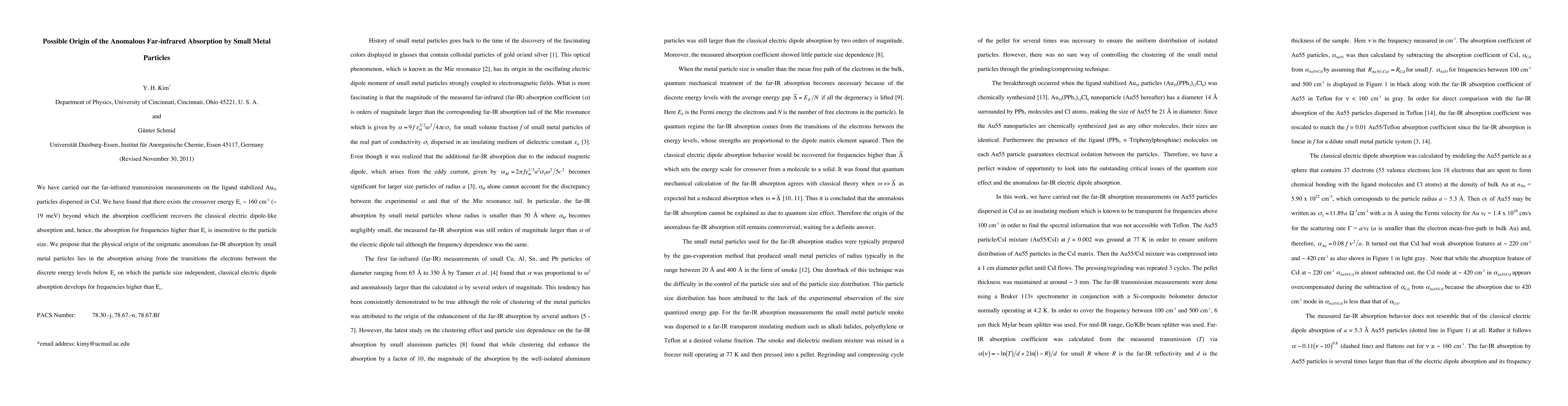This paper investigates the anomalous far-infrared absorption in small Au55 particles, finding a crossover energy Ec ~ 160 cm-1. Above this energy, classical electric dipole absorption is observed, independent of particle size, suggesting the anomalous absorption below Ec is due to electron transitions between discrete energy levels.
