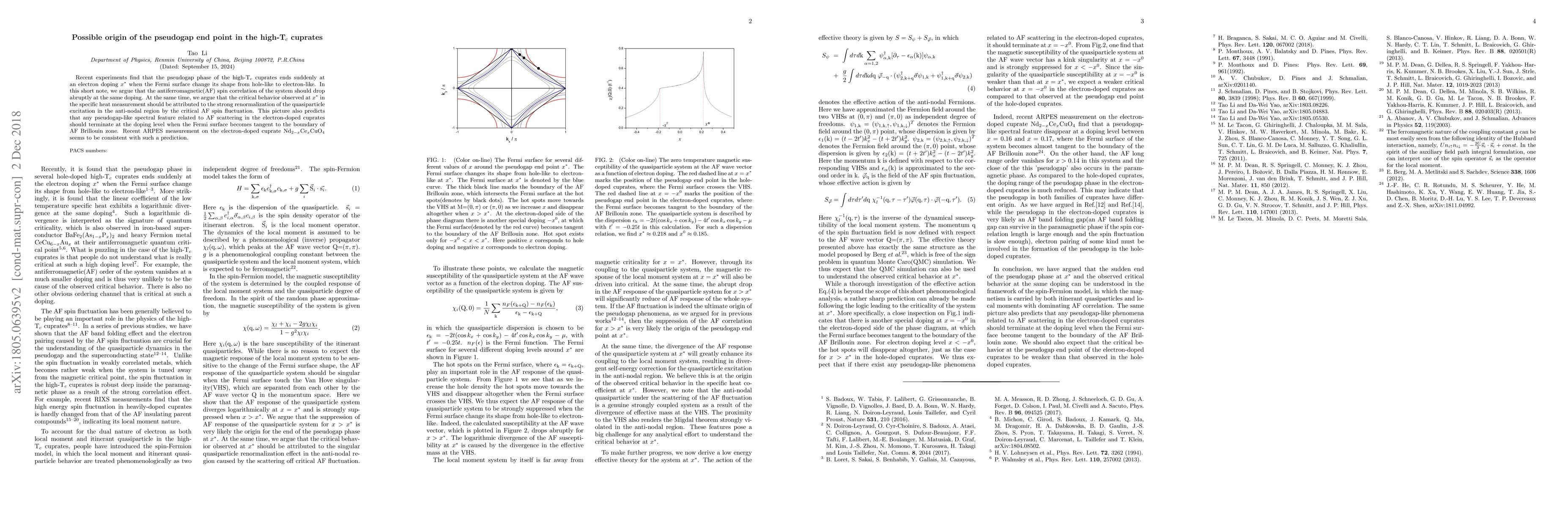 Researchers propose that the pseudogap end point in high-Tc cuprates ends abruptly at a specific doping level where the Fermi surface changes from hole-like to electron-like, accompanied by a sudden drop in antiferromagnetic spin correlation. This prediction is supported by recent ARPES measurements on electron-doped cuprates.
