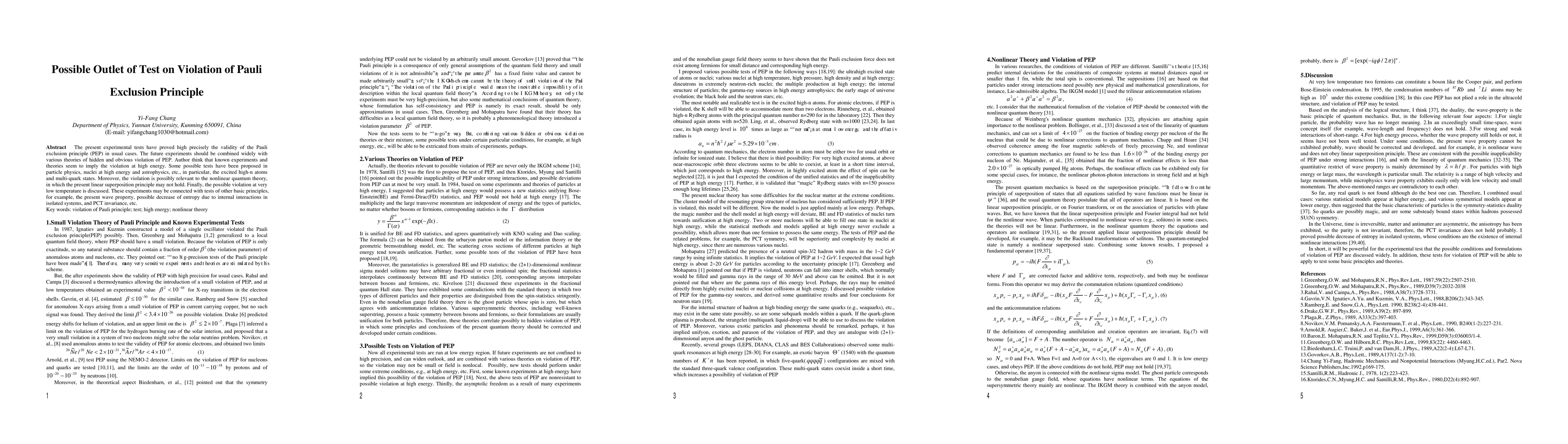 This paper discusses the high precision validation of the Pauli exclusion principle (PEP) and proposes future experiments exploring potential violations at high energy, in particle physics, nuclear physics, and astrophysics, including excited high-n atoms and multi-quark states. It also considers the implications of nonlinear quantum theory and possible violations at very low temperatures, linking these to tests of other fundamental principles.