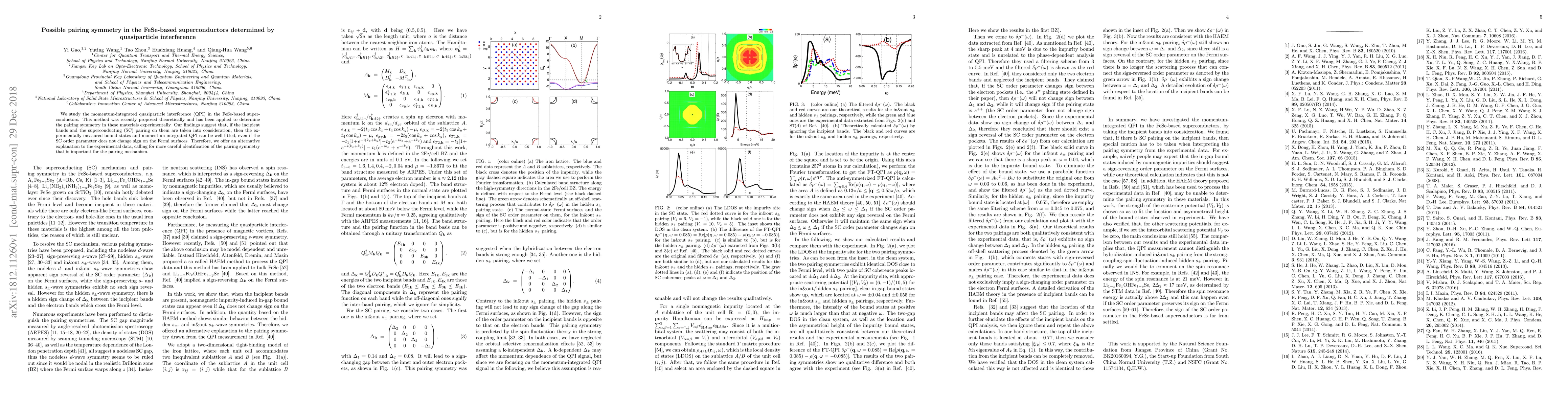 This research investigates FeSe-based superconductors using momentum-integrated quasiparticle interference (QPI). The study proposes an alternative explanation for experimental data, suggesting that the superconducting order parameter may not change sign on Fermi surfaces when considering incipient bands and pairing, thereby challenging previous assumptions on pairing symmetry identification.