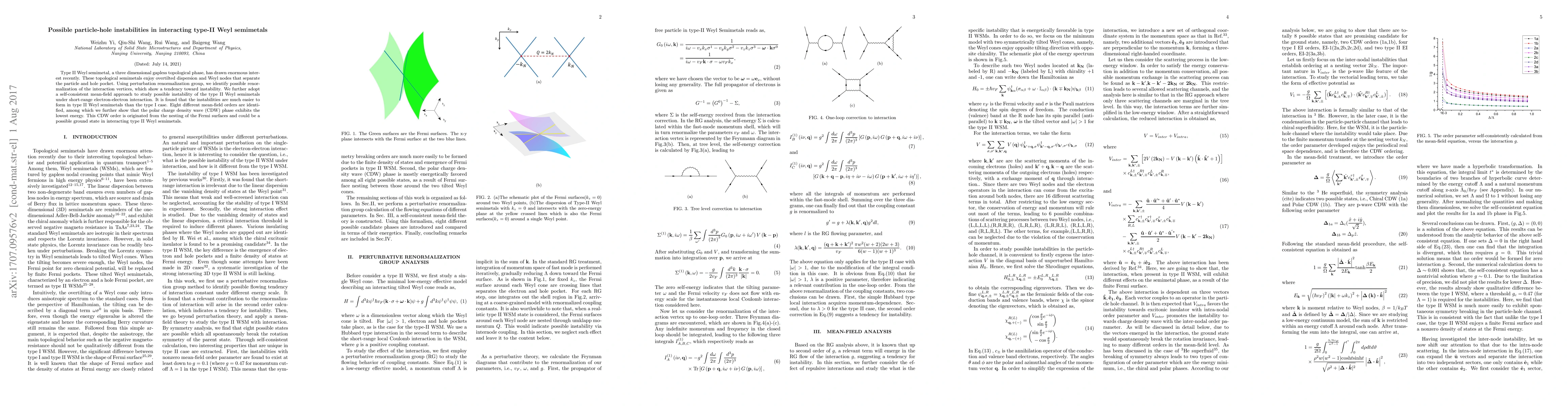This research identifies potential particle-hole instabilities in type II Weyl semimetals using perturbation renormalization group and self-consistent mean-field approaches. The study reveals that these instabilities are more prevalent in type II Weyl semimetals compared to type I, leading to the identification of eight mean-field orders, with the polar charge density wave phase emerging as the most energetically favorable ground state.
