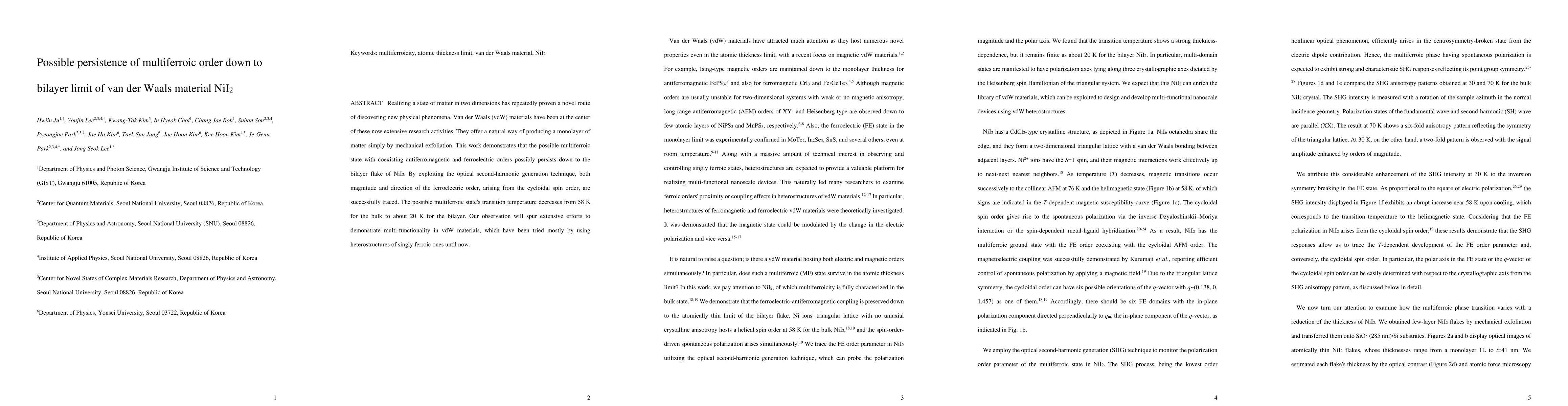 Researchers found that a specific van der Waals material, NiI2, can exhibit multiferroic properties even in its thinnest bilayer form. The study uses optical second-harmonic generation to track the ferroelectric order and reveals its transition temperature decreases as it gets thinner.