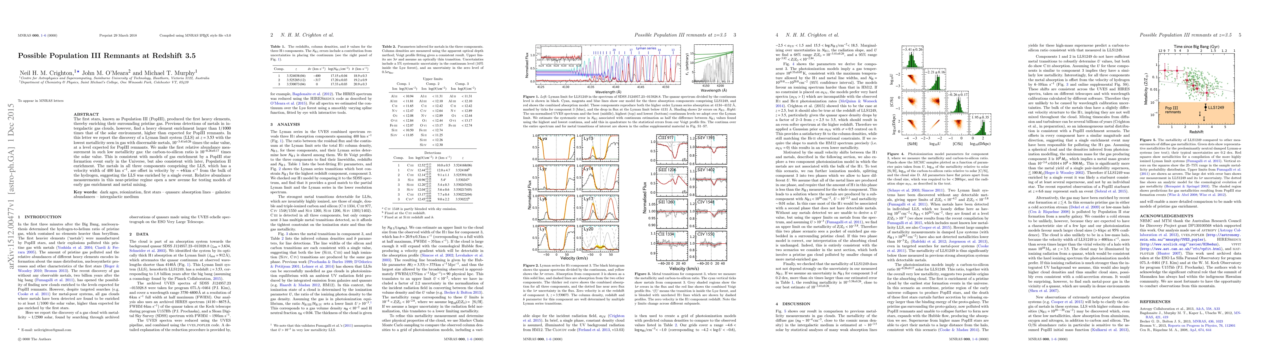 The first stars, known as Population III (PopIII), produced the first heavy elements, thereby enriching their surrounding pristine gas. Previous detections of metals in intergalactic gas clouds, however, find a heavy element enrichment larger than $1/1000$ times that of the solar environment, higher than expected for PopIII remnants. In this letter we report the discovery of a Lyman limit system (LLS) at $z=3.53$ with the lowest metallicity seen in gas with discernable metals, $10^{-3.41\pm0.26}$ times the solar value, at a level expected for PopIII remnants. We make the first relative abundance measurement in such low metallicity gas: the carbon-to-silicon ratio is $10^{-0.26\pm0.17}$ times the solar value. This is consistent with models of gas enrichment by a PopIII star formation event early in the Universe, but also consistent with later, Population II enrichment. The metals in all three components comprising the LLS, which has a velocity width of 400 km s$^{-1}$, are offset in velocity by $\sim+6$ km s$^{-1}$ from the bulk of the hydrogen, suggesting the LLS was enriched by a single event. Relative abundance measurements in this near-pristine regime open a new avenue for testing models of early gas enrichment and metal mixing.