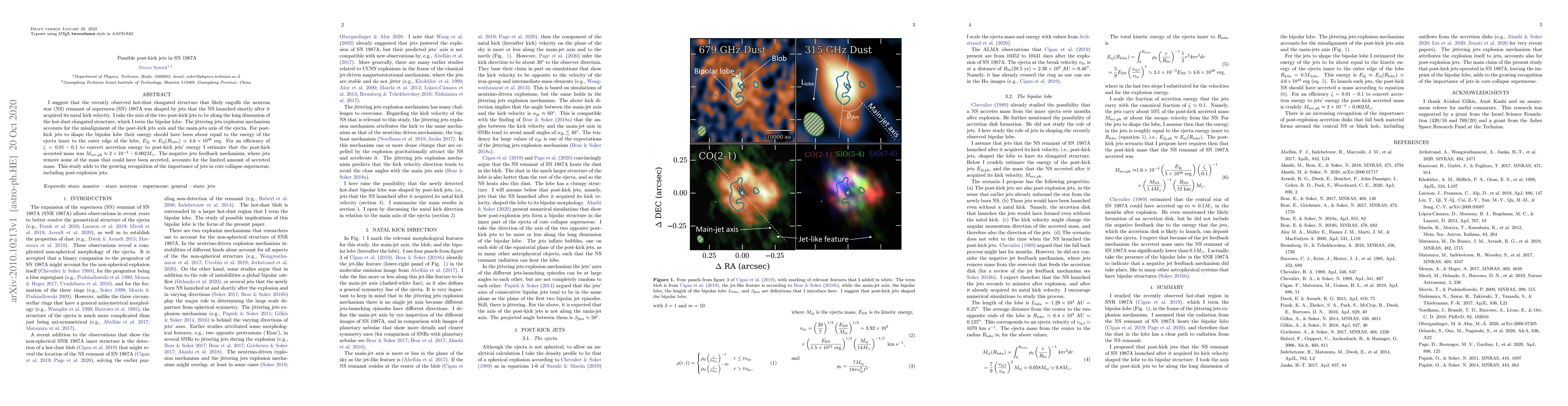 This paper proposes that the hot-dust structure surrounding the neutron star remnant of SN 1987A was shaped by jets launched shortly after the star's kick, suggesting that these post-kick jets had energy comparable to the supernova ejecta. The study estimates the accreted mass needed to power these jets and discusses the role of jets in shaping the bipolar lobe and influencing the supernova's evolution.