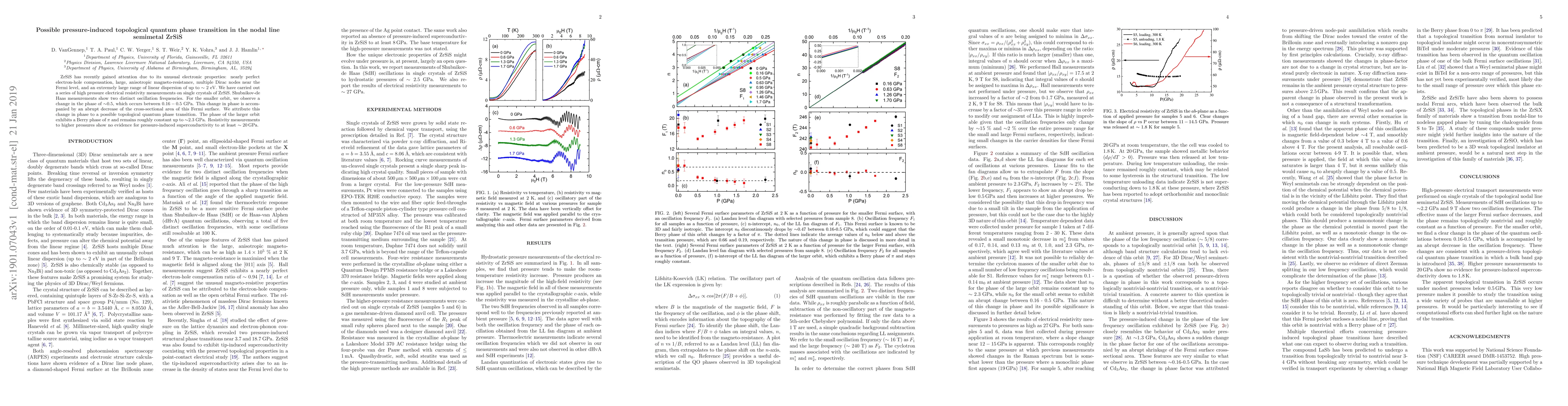 ZrSiS has recently gained attention due to its unusual electronic properties: nearly perfect electron-hole compensation, large, anisotropic magneto-resistance, multiple Dirac nodes near the Fermi level, and an extremely large range of linear dispersion of up to 2 eV. We have carried out a series of high pressure electrical resistivity measurements on single crystals of ZrSiS. Shubnikov-de Haas measurements show two distinct oscillation frequencies. For the smaller orbit, we observe a change in the phase of 0.5, which occurs between 0.16 - 0.5 GPa. This change in phase is accompanied by an abrupt decrease of the cross-sectional area of this Fermi surface. We attribute this change in phase to a possible topological quantum phase transition. The phase of the larger orbit exhibits a Berry phase of pi and remains roughly constant up to 2.3 GPa. Resistivity measurements to higher pressures show no evidence for pressure-induced superconductivity to at least 20 GPa.