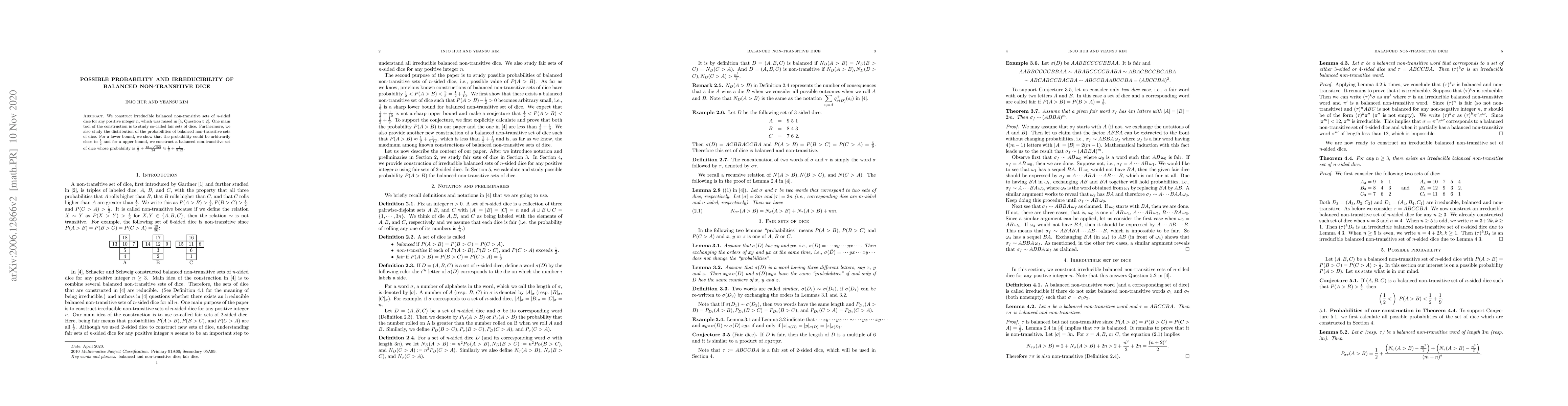 We construct irreducible balanced non-transitive sets of $n$-sided dice for any positive integer $n$, which was raised in \cite[Question 5.2]{SS17}. One main tool of the construction is to study so-called fair sets of dice. Furthermore, we also study the distribution of the probabilities of balanced non-transitive sets of dice. For a lower bound, we show that the probability could be arbitrarily close to $\frac{1}{2}$ and for a upper bound, we construct a balanced non-transitive set of dice whose probability is $\frac{1}{2} + \frac{13-\sqrt{153}}{24} \approx \frac{1}{2} + \frac{1}{9.12}.$