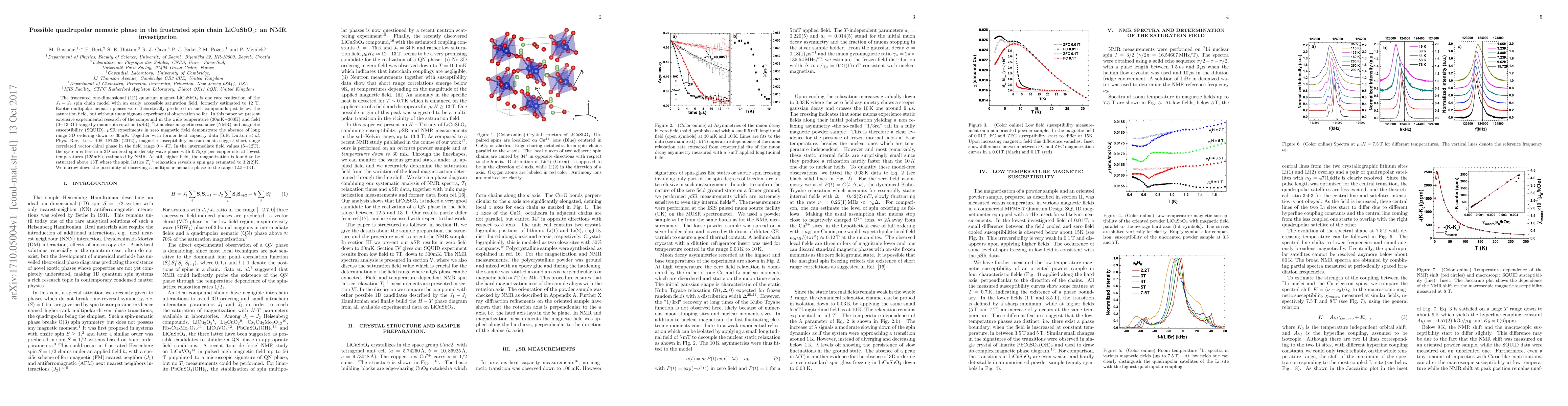This paper investigates the magnetic properties of the frustrated spin chain compound LiCuSbO$_4$ using $\mu$SR, $^7$Li NMR, and SQUID measurements. The study suggests the potential existence of a quadrupolar nematic phase in the field range of 12.5$-$13T, with no long-range 3D ordering observed down to 30mK.