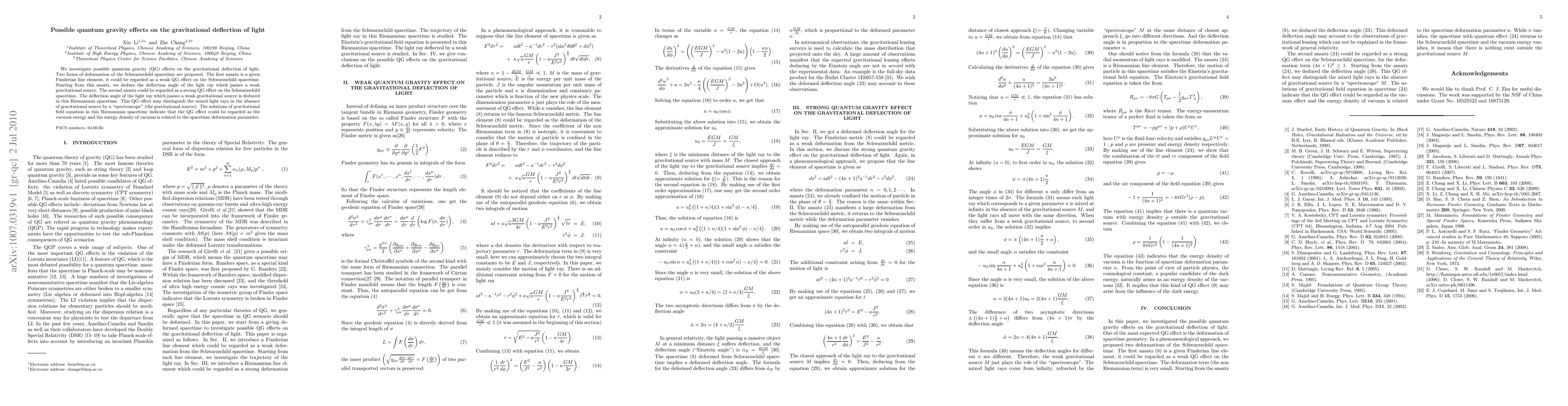 This paper explores quantum gravity (QG) effects on the gravitational deflection of light, proposing two spacetime deformations: a Finslerian model for weak QG effects and a Riemannian model for strong QG effects. It deduces the deflection angles in both models and suggests that QG effects could distinguish mixed light rays via gravitational sources.