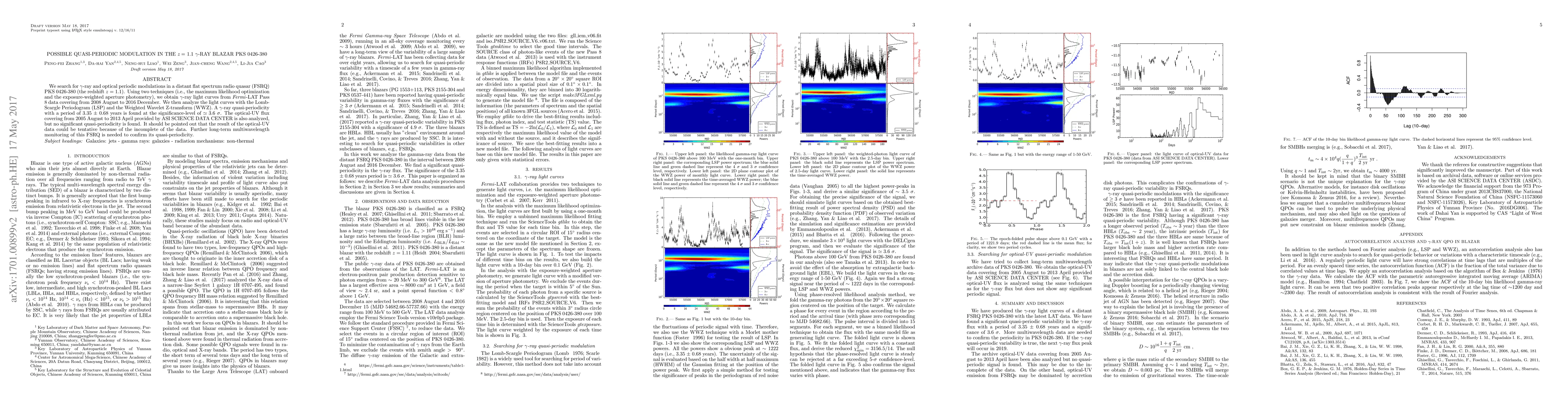 We search for $\gamma$-ray and optical periodic modulations in a distant flat spectrum radio quasar (FSRQ) PKS 0426-380 (the redshift $z=1.1$). Using two techniques (i.e., the maximum likelihood optimization and the exposure-weighted aperture photometry), we obtain $\gamma$-ray light curves from \emph{Fermi}-LAT Pass 8 data covering from 2008 August to 2016 December. We then analyze the light curves with the Lomb-Scargle Periodogram (LSP) and the Weighted Wavelet Z-transform (WWZ). A $\gamma$-ray quasi-periodicity with a period of 3.35 $\pm$ 0.68 years is found at the significance-level of $\simeq3.6\ \sigma$. The optical-UV flux covering from 2005 August to 2013 April provided by ASI SCIENCE DATA CENTER is also analyzed, but no significant quasi-periodicity is found. It should be pointed out that the result of the optical-UV data could be tentative because of the incomplete of the data. Further long-term multiwavelength monitoring of this FSRQ is needed to confirm its quasi-periodicity.