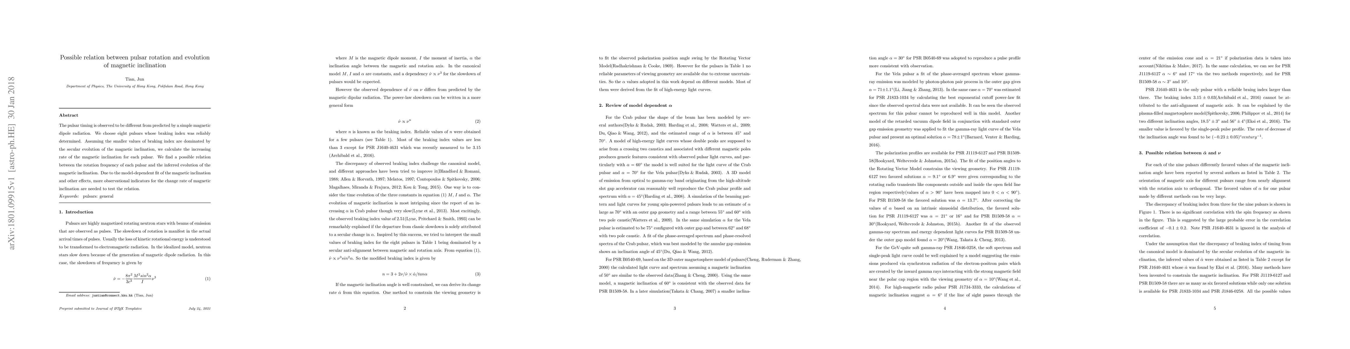 The pulsar timing is observed to be different from predicted by a simple magnetic dipole radiation. We choose eight pulsars whose braking index was reliably determined. Assuming the smaller values of braking index are dominated by the secular evolution of the magnetic inclination, we calculate the increasing rate of the magnetic inclination for each pulsar. We find a possible relation between the rotation frequency of each pulsar and the inferred evolution of the magnetic inclination. Due to the model-dependent fit of the magnetic inclination and other effects, more observational indicators for the change rate of magnetic inclination are needed to test the relation.