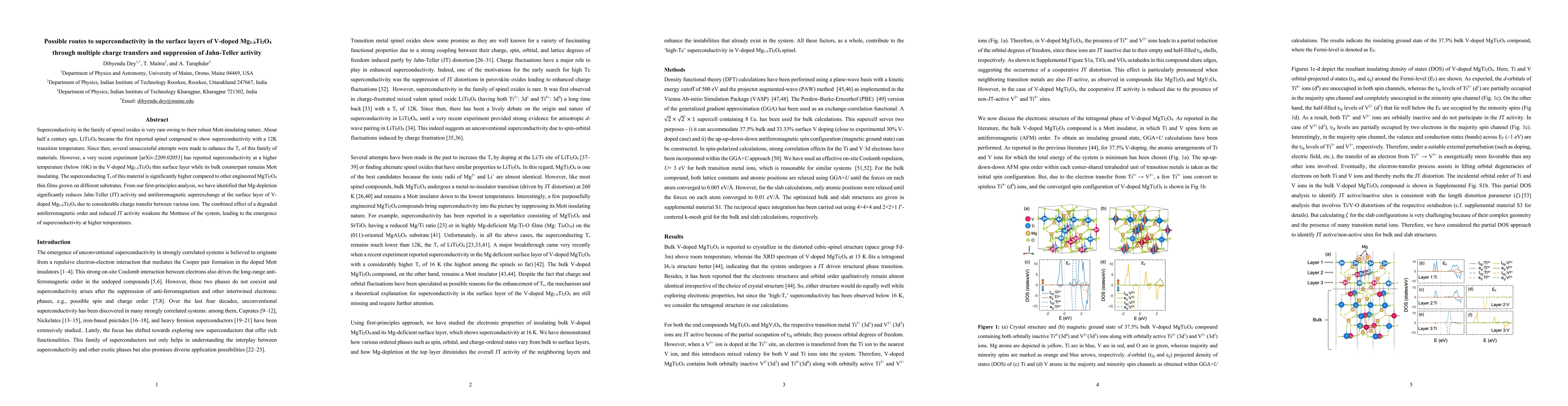 This paper explores the emergence of superconductivity in the surface layers of V-doped Mg$_{1-\delta}$Ti$_2$O$_4$ thin films, attributing it to reduced Jahn-Teller activity and enhanced charge transfer, which weakens the Mott-insulating nature and facilitates higher transition temperatures. The findings suggest a pathway to achieving superconductivity in spinel oxides through surface engineering.