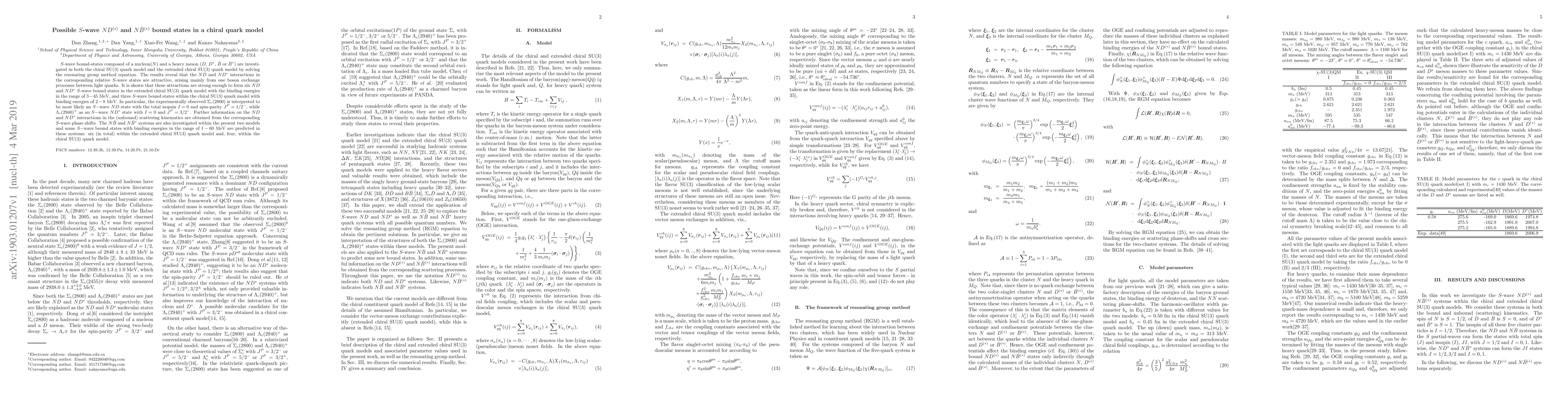 This paper explores $S$-wave bound states formed by nucleons and heavy mesons ($ND$ and $ND^*$) in chiral quark models, predicting six $ND$ and $ND^*$ bound states with binding energies of $3-45$ MeV in the extended model and three in the chiral model. It also identifies $\Sigma_c(2800)$ and $\Lambda_c(2940)^+$ as specific $ND$ and $ND^*$ states, respectively.