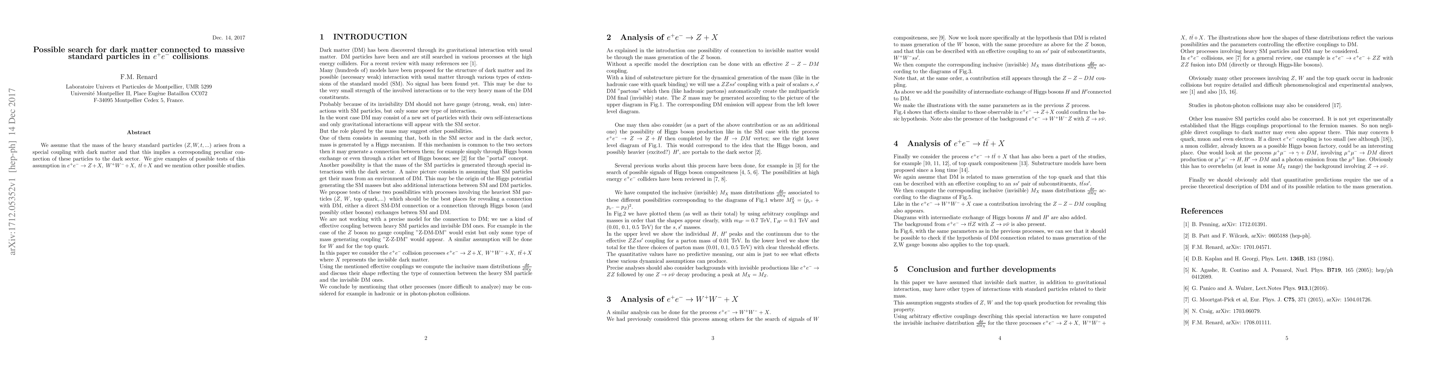 We assume that the mass of the heavy standard particles ($Z,W,t,...$) arises from a special coupling with dark matter and that this implies a corresponding peculiar connection of these particles to the dark sector. We give examples of possible tests of this assumption in $e^+e^-\to Z+X,~ W^+W^-+X, ~t\bar t+X$ and we mention other possible studies.