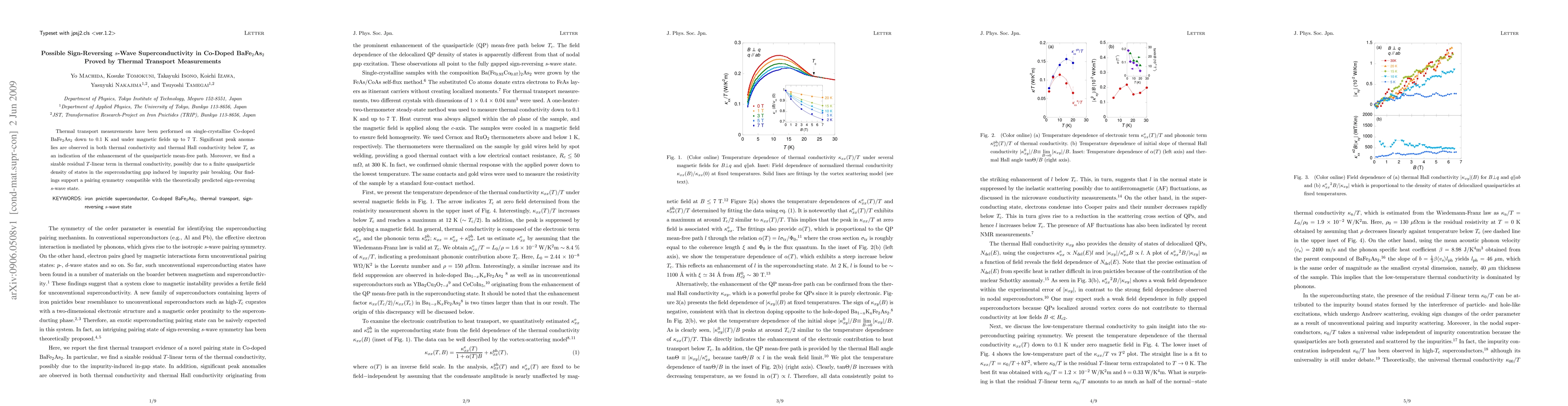 Researchers found evidence of sign-reversing s-wave superconductivity in a Co-doped BaFe2As2 material using thermal transport measurements, indicating enhanced quasiparticle mean-free paths and residual T-linear terms in thermal conductivity.