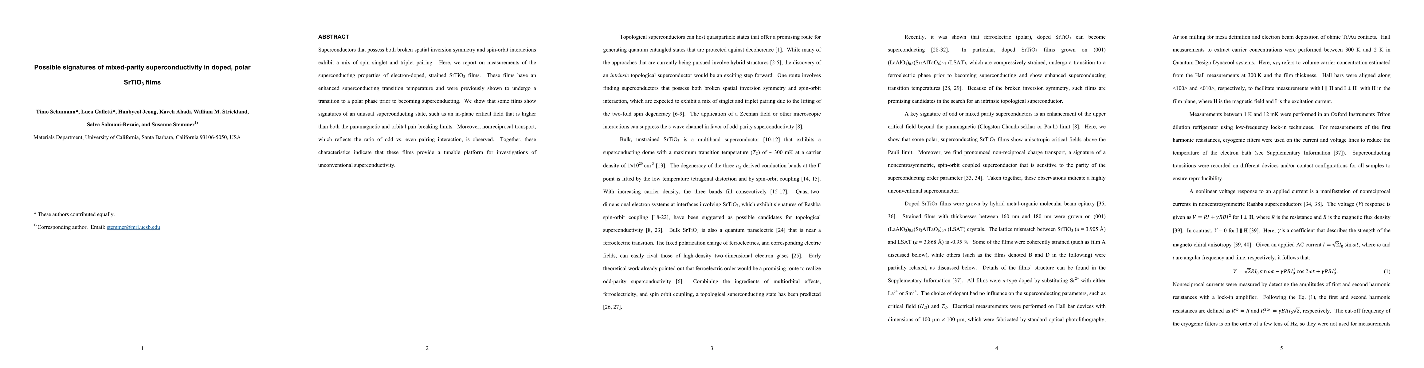 Superconductors that possess both broken spatial inversion symmetry and spin-orbit interactions exhibit a mix of spin singlet and triplet pairing. Here, we report on measurements of the superconducting properties of electron-doped, strained SrTiO3 films. These films have an enhanced superconducting transition temperature and were previously shown to undergo a transition to a polar phase prior to becoming superconducting. We show that some films show signatures of an unusual superconducting state, such as an in-plane critical field that is higher than both the paramagnetic and orbital pair breaking limits. Moreover, nonreciprocal transport, which reflects the ratio of odd versus even pairing interactions, is observed. Together, these characteristics indicate that these films provide a tunable platform for investigations of unconventional superconductivity.
