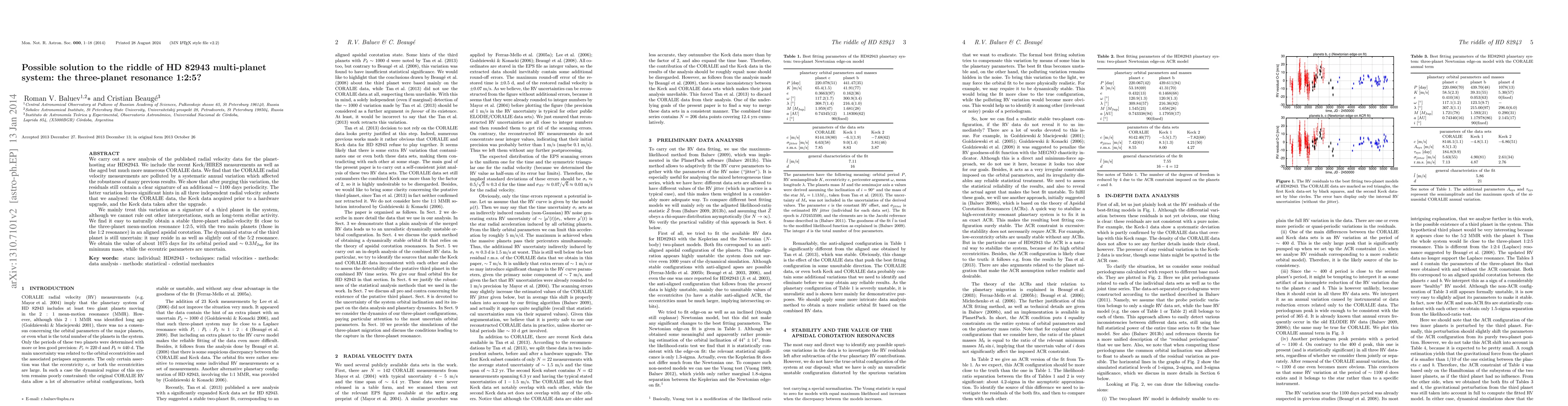 We carry out a new analysis of the published radial velocity data for the planet-hosting star HD82943. We include the recent Keck/HIRES measurements as well as the aged but much more numerous CORALIE data. We find that the CORALIE radial velocity measurements are polluted by a systematic annual variation which affected the robustness of many previous results. We show that after purging this variation, the residuals still contain a clear signature of an additional $\sim 1100$ days periodicity. The latter variation leaves significant hints in all three independent radial velocity subsets that we analysed: the CORALIE data, the Keck data acquired prior to a hardware upgrade, and the Keck data taken after the upgrade. We mainly treat this variation as a signature of a third planet in the system, although we cannot rule out other interpretations, such as long-term stellar activity. We find it easy to naturally obtain a stable three-planet radial-velocity fit close to the three-planet mean-motion resonance 1:2:5, with the two main planets (those in the 1:2 resonance) in an aligned apsidal corotation. The dynamical status of the third planet is still uncertain: it may reside in as well as slightly out of the 5:2 resonance. We obtain the value of $\sim 1075$ days for its orbital period and of $\sim 0.3 M_{\rm Jup}$ for its minimum mass, while the eccentric parameters are uncertain.
