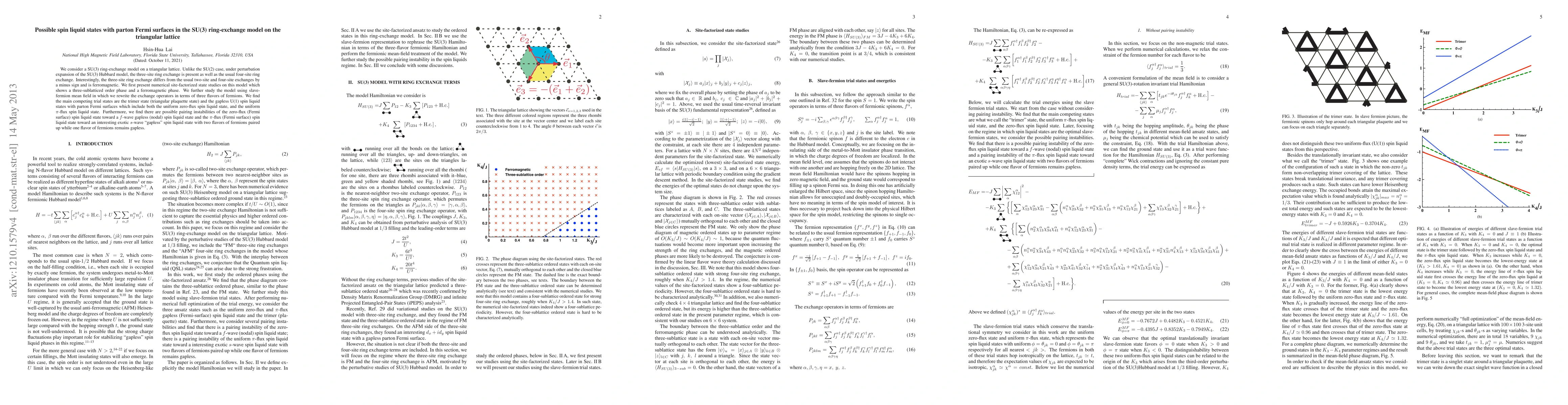 This paper explores a SU(3) ring-exchange model on a triangular lattice, revealing the presence of three-site ring exchange alongside the usual four-site exchange. Numerical studies and slave-fermion mean field theory suggest competing spin liquid states, including trimer states and gapless U(1) spin liquid states with parton Fermi surfaces, alongside potential pairing instabilities leading to exotic spin liquid phases.