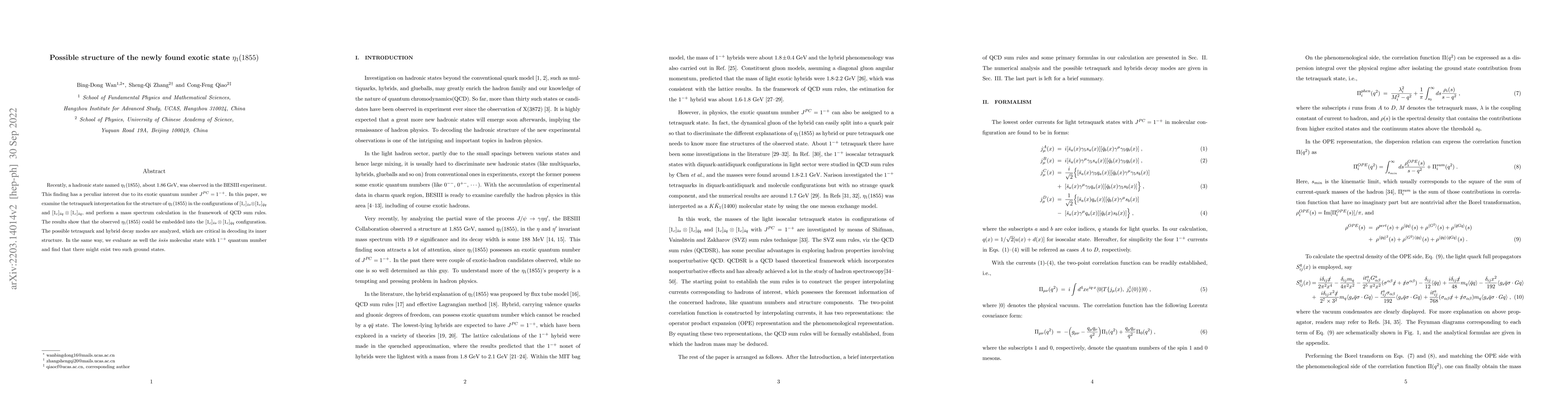 Recently, a hadronic state named $\eta_1(1855)$, about 1.86 GeV, was observed in the BESIII experiment. This finding has a peculiar interest due to its exotic quantum number $J^{PC}=1^{-+}$. In this paper, we examine the tetraquark interpretation for the structure of $\eta_1(1855)$ in the configurations of $[1_c]_{\bar{s}s}\otimes[1_c]_{\bar{q}q}$ and $[1_c]_{\bar{s}q}\otimes[1_c]_{\bar{s}q}$, and perform a mass spectrum calculation in the framework of QCD sum rules. The results show that the observed $\eta_1(1855)$ could be embedded into the $[1_c]_{\bar{s}s}\otimes[1_c]_{\bar{q}q}$ configuration. The possible tetraquark and hybrid decay modes are analyzed, which are critical in decoding its inner structure. In the same way, we evaluate as well the $\bar{s}s\bar{s}s$ molecular state with $1^{-+}$ quantum number and find that there might exist two such ground states.