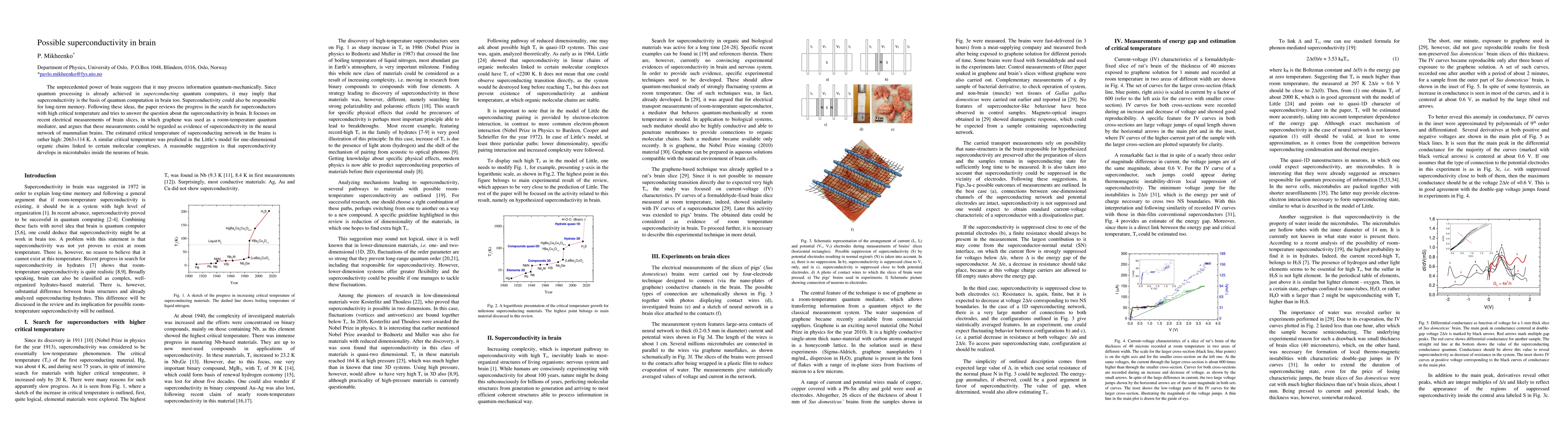 The unprecedented power of the brain suggests that it may process information quantum-mechanically. Since quantum processing is already achieved in superconducting quantum computers, it may imply that superconductivity is the basis of quantum computation in brain too. Superconductivity could also be responsible for long-term memory. Following these ideas, the paper reviews the progress in the search for superconductors with high critical temperature and tries to answer the question about the superconductivity in brain. It focuses on recent electrical measurements of brain slices, in which graphene was used as a room-temperature quantum mediator, and argues that these measurements could be interpreted as providing evidence of superconductivity in the neural network of mammalian brains. The estimated critical temperature of superconducting network in brain is rather high: 2063 plus-minus 114 K. A similar critical temperature was predicted in the Little's model for one-dimensional organic chains linked to certain molecular complexes. A reasonable suggestion is that superconductivity develops in microtubules inside the neurons of brain.