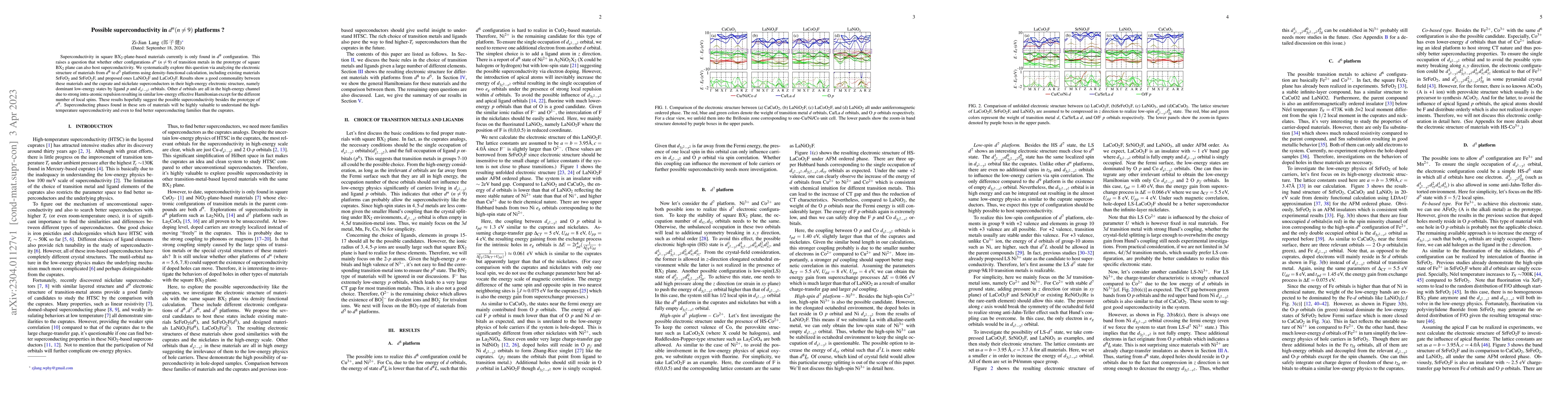 Superconductivity in square BX$_2$-plane-based materials currently is only found in $d^9$ configuration. This raises a question that whether other configurations $d^{n}$ ($n\neq 9$) of transition metals in the prototype of square BX$_2$ plane can also host superconductivity. We systematically explore this question via analyzing the electronic structure of materials from $d^{8}$ to $d^5$ platforms using density-functional calculation, including existing materials SrFeO$_2$ and SrFeO$_2$F, and proposed ones LaNiO$_2$F and LaCoO$_2$F. Results show a good commonality between these materials and the cuprate and nickelate superconductors in their high-energy electronic structure, namely dominant low-energy states by ligand $p$ and $d_{x^2-y^2}$ orbitals. Other $d$ orbitals are all in the high-energy channel due to strong intra-atomic repulsion resulting in similar low-energy effective Hamiltonian except for the different number of local spins. These results hopefully suggest the possible superconductivity besides the prototype of $d^9$. Superconducting phases found in these sets of materials will be highly valuable to understand the high-temperature superconductivity and even to find better superconducting families than the cuprates.
