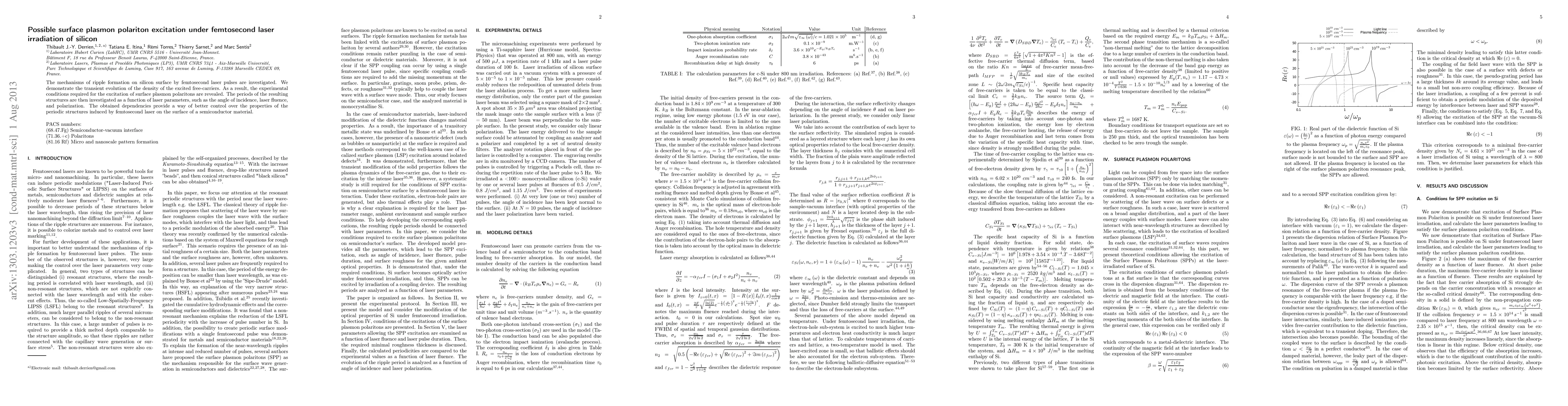 This study investigates the mechanisms behind ripple formation on silicon surfaces via femtosecond laser pulses, revealing conditions for surface plasmon polariton excitation. The research explores the influence of laser parameters like angle, fluence, and polarization on the resulting structure periods, offering insights for controlling periodic structures on semiconductor materials.