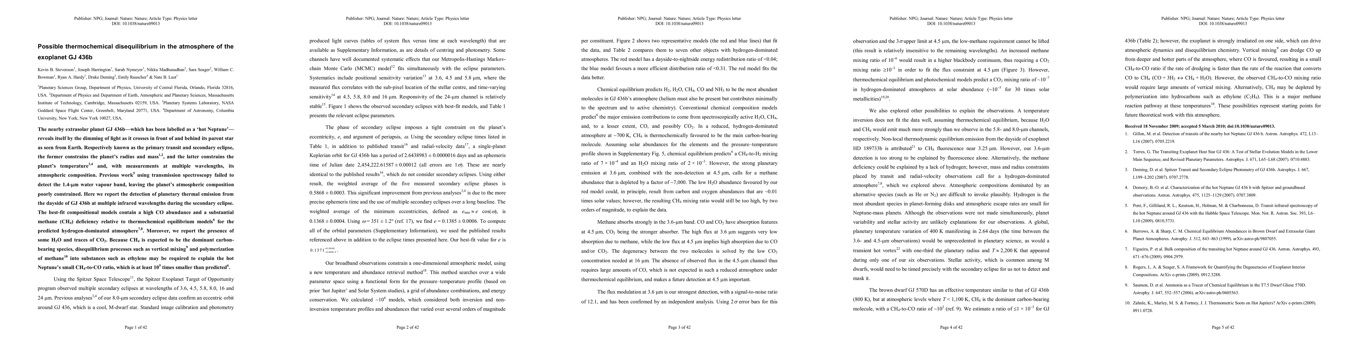 This study detects thermal emission from the exoplanet GJ 436b, revealing a high CO abundance and a significant methane deficiency in its atmosphere, suggesting disequilibrium processes like vertical mixing or methane polymerization. These findings challenge thermochemical equilibrium models for the planet's composition.