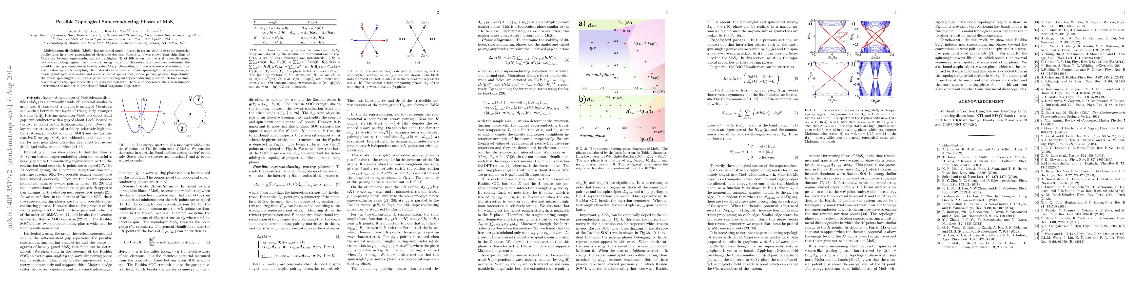 This paper explores the pairing symmetries of heavily gated MoS$_2$ using group theory, revealing potential superconducting phases including a topological $p+ip$ phase with spontaneous time-reversal symmetry breaking and chiral Majorana edge states. It also identifies exotic spin-triplet s-wave and conventional spin-triplet p-wave pairing possibilities.