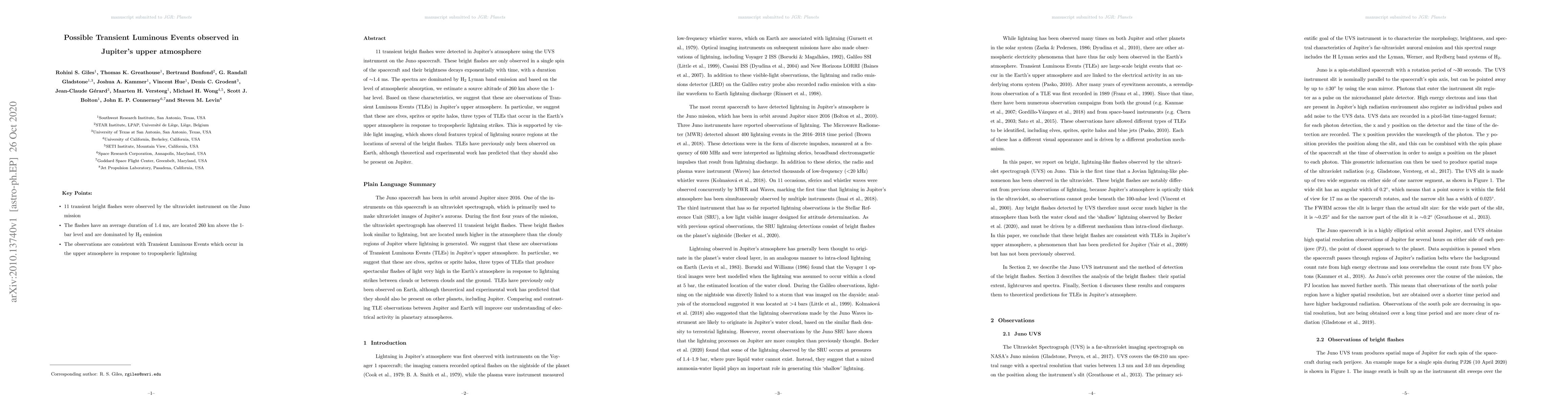 This paper reports the detection of 11 transient bright flashes in Jupiter's upper atmosphere using the Juno spacecraft's UVS instrument, suggesting the presence of Transient Luminous Events (TLEs) such as elves, sprites, or sprite halos. These events are characterized by H2 Lyman band emission and are likely linked to lightning activity.
