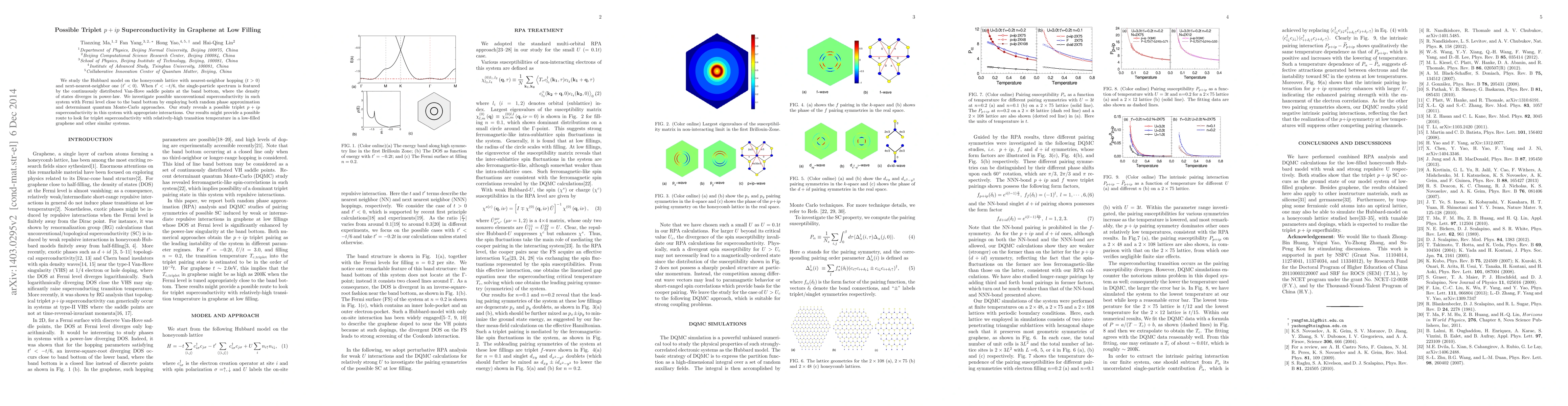 We study the Hubbard model on the honeycomb lattice with nearest-neighbor hopping ($t>0$) and next-nearest-neighbor one ($t'<0$). When $t'<-t/6$, the single-particle spectrum is featured by the continuously distributed Van-Hove saddle points at the band bottom, where the density of states diverges in power-law. We investigate possible unconventional superconductivity in such system with Fermi level close to the band bottom by employing both random phase approximation and determinant quantum Monte-Carlo approaches. Our study reveals a possible triplet $p+ip$ superconductivity in this system with appropriate interactions. Our results might provide a possible route to look for triplet superconductivity with relatively-high transition temperature in a low-filled graphene and other similar systems.