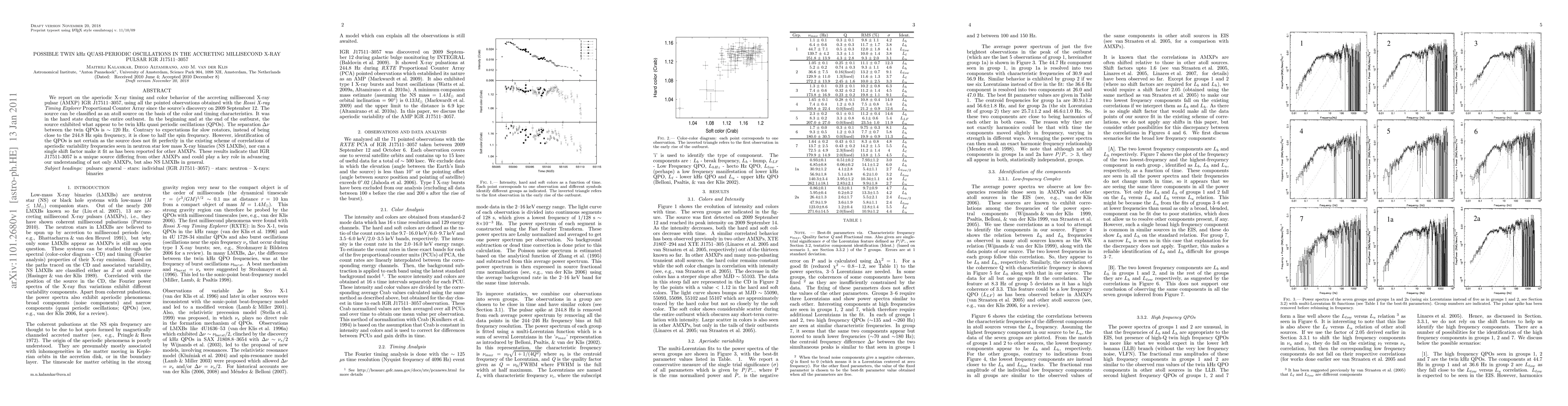 This paper investigates the aperiodic X-ray timing and color behavior of the accreting millisecond X-ray pulsar IGR J17511-3057, identifying potential twin kHz quasi-periodic oscillations (QPOs) at the beginning and end of its outburst. The source exhibits unique QPO characteristics differing from typical neutron star low mass X-ray binaries, suggesting it may advance our understanding of both accreting millisecond pulsars and NS LMXBs.