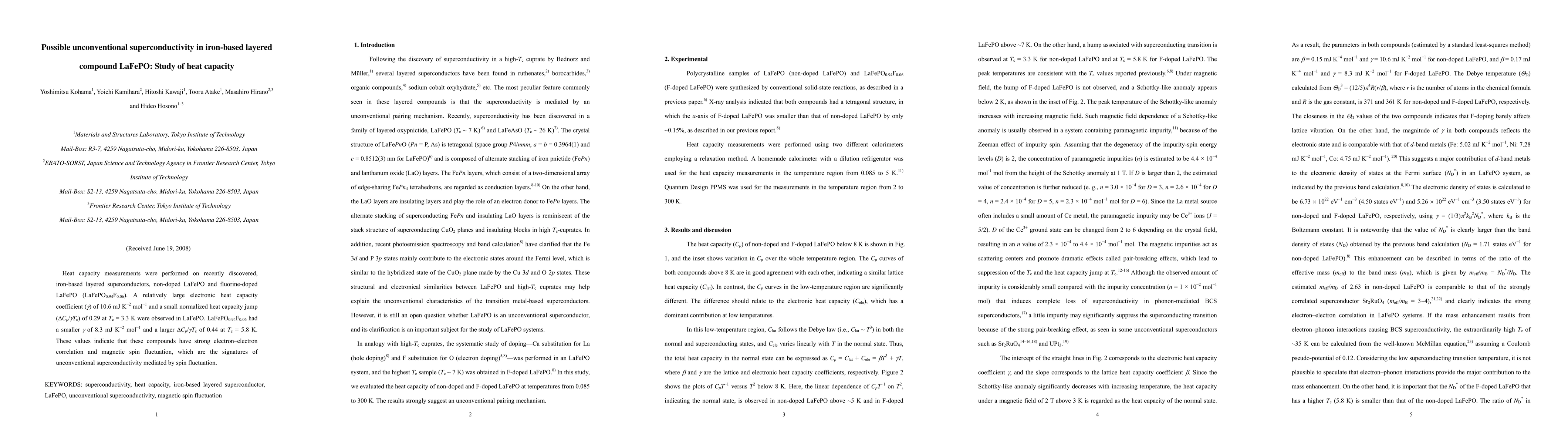 Heat capacity measurements on iron-based layered superconductors LaFePO and fluorine-doped LaFePO reveal strong electron-electron correlation and magnetic spin fluctuation, suggesting unconventional superconductivity mediated by spin fluctuation, with different critical temperatures and heat capacity behaviors for each compound.