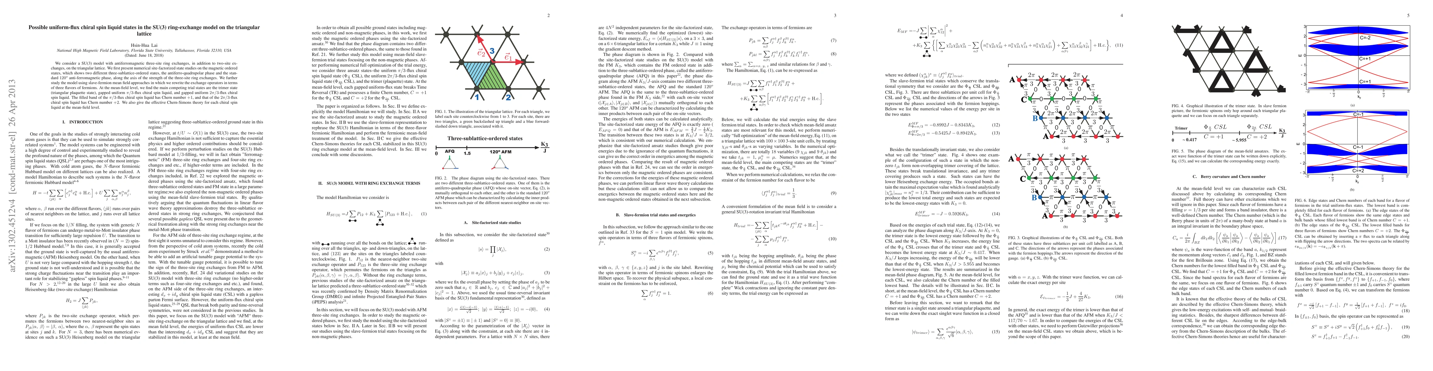 This paper explores a SU(3) spin model on a triangular lattice with ring-exchange interactions, identifying several magnetic ordered states and potential chiral spin liquid phases. Numerical and mean-field studies reveal competing trial states including trimer states and two types of chiral spin liquids with distinct Chern numbers.