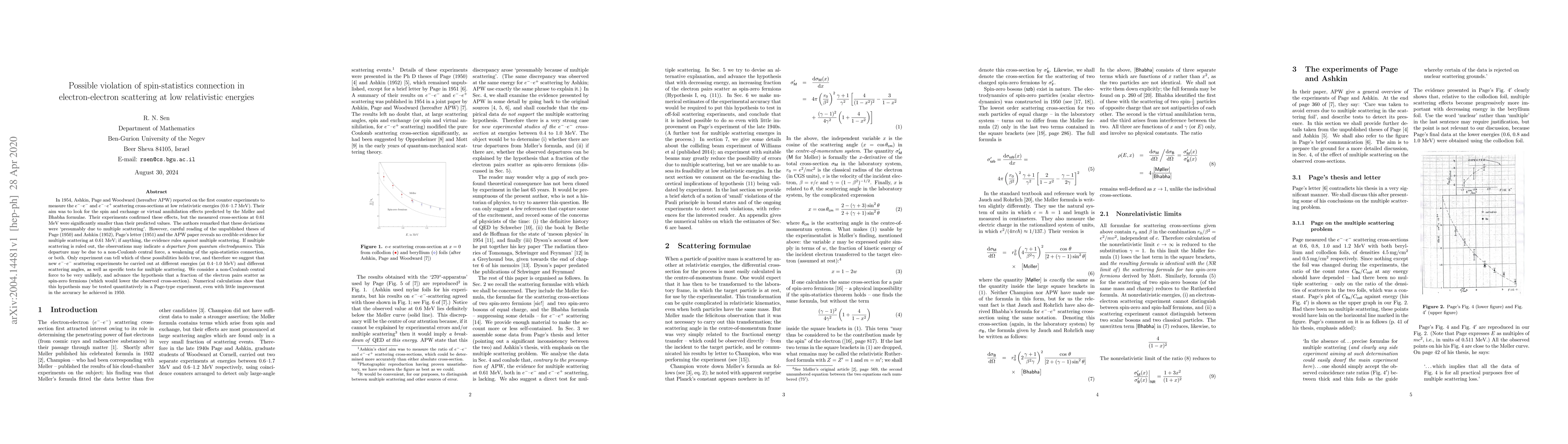 In 1954, Ashkin, Page and Woodward (hereafter APW) reported on the first counter experiments to measure the electron-electron and electron-positron scattering cross-sections at low relativistic energies (0.6-1.7 MeV). Their aim was to look for the spin and exchange or virtual annihilation effects predicted by the Moller and Bhabha formulae. Their experiments confirmed these effects, but the measured cross-sections at 0.61 MeV were significantly smaller than their predicted values. The authors remarked that these deviations were `presumably due to multiple scattering'. However, careful reading of the unpublished theses of Page (1950) and Ashkin (1952), Page's letter (1951) and the APW paper reveals no credible evidence of multiple scattering at 0.61 MeV; if anything, the evidence rules against multiple scattering. If multiple scattering is ruled out, the observations may indicate a departure from quantum electrodynamics. This departure may be due to a non-Coulomb central force, a weakening of the spin-statistics connection, or both. Only experiment can tell which of these possibilities holds true, and therefore we suggest the new electron-electron scattering experiments be carried out at different energies (at 0.4-1.0 MeV) and different scattering angles, as well as specific tests for multiple scattering. We consider a non-Coulomb central force to be very unlikely, and advance the hypothesis that a fraction of the electron pairs scatter as spin-zero fermions (which would lower the observed cross-section). Numerical calculations show that the hypothesis may be tested quantitatively in a Page-type experiment, even with little improvement in the accuracy he achieved in 1950.