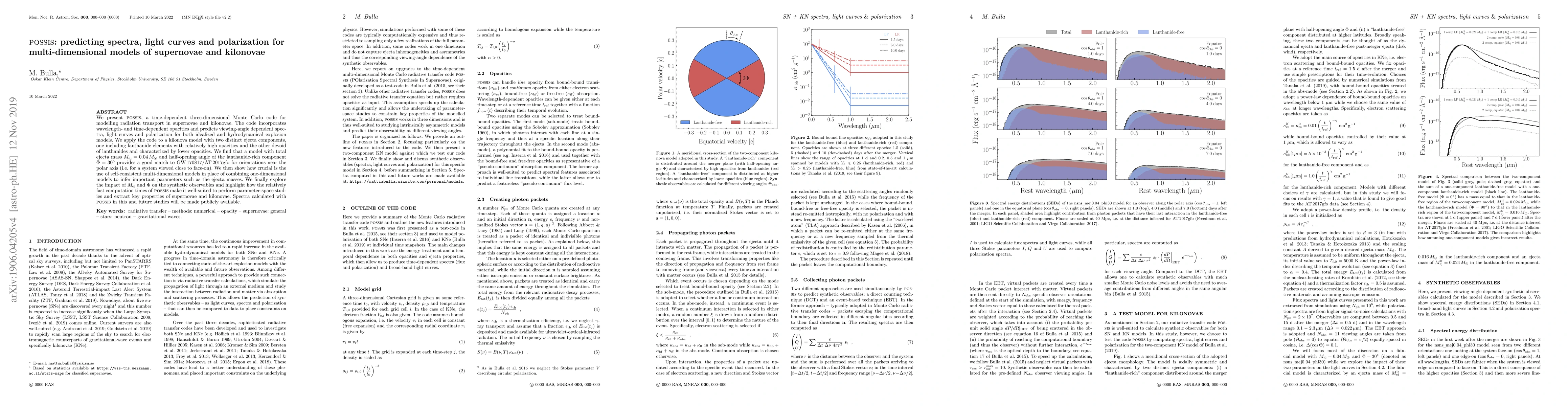 POSSIS is a three-dimensional Monte Carlo code for modeling radiation transport in supernovae and kilonovae, predicting spectra, light curves, and polarization. It successfully matches the kilonova GW 170817/AT 2017gfo model with specific ejecta mass and angle, emphasizing the importance of multi-dimensional models over one-dimensional approaches for accurate parameter inference.