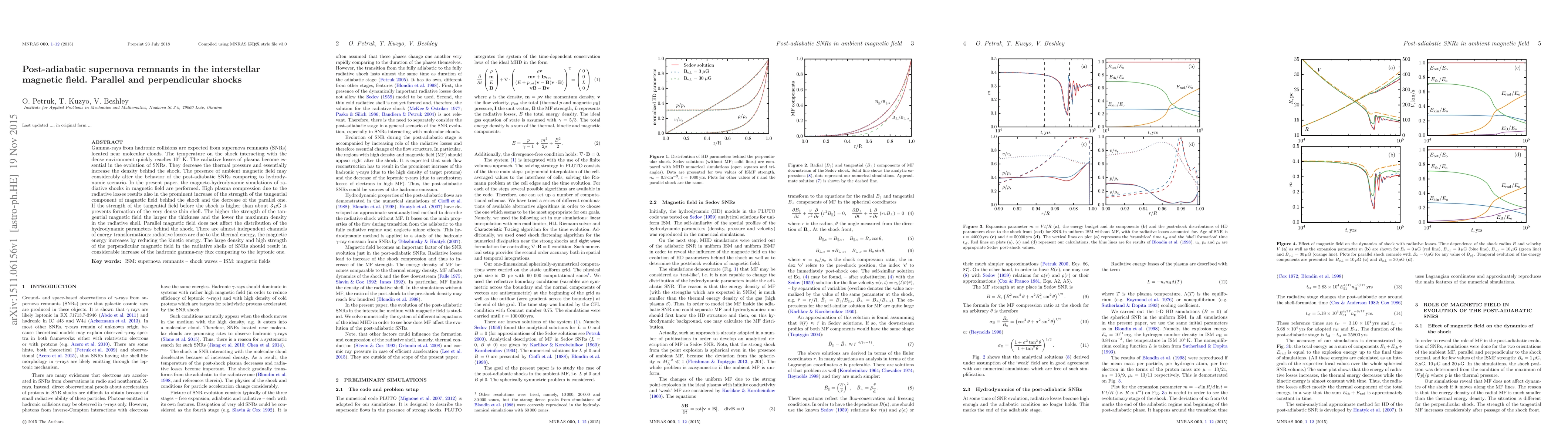 Gamma-rays from hadronic collisions are expected from supernova remnants (SNRs) located near molecular clouds. The temperature on the shock interacting with the dense environment quickly reaches $10^5$ K. The radiative losses of plasma become essential in the evolution of SNRs. They decrease the thermal pressure and essentially increase the density behind the shock. The presence of ambient magnetic field may considerably alter the behavior of the post-adiabatic SNRs comparing to hydrodynamic scenario. In the present paper, the magneto-hydrodynamic simulations of radiative shocks in magnetic field are performed. High plasma compression due to the radiative losses results also in the prominent increase of the strength of the tangential component of magnetic field behind the shock and the decrease of the parallel one. If the strength of the tangential field before the shock is higher than about $3\mathrm{\mu G}$ it prevents formation of the very dense thin shell. The higher the strength of the tangential magnetic field the larger the thickness and the lower the maximum density in the radiative shell. Parallel magnetic field does not affect the distribution of the hydrodynamic parameters behind the shock. There are almost independent channels of energy transformations: radiative losses are due to the thermal energy, the magnetic energy increases by reducing the kinetic energy. The large density and high strength of the perpendicular magnetic field in the radiative shells of SNRs should result in considerable increase of the hadronic gamma-ray flux comparing to the leptonic one.