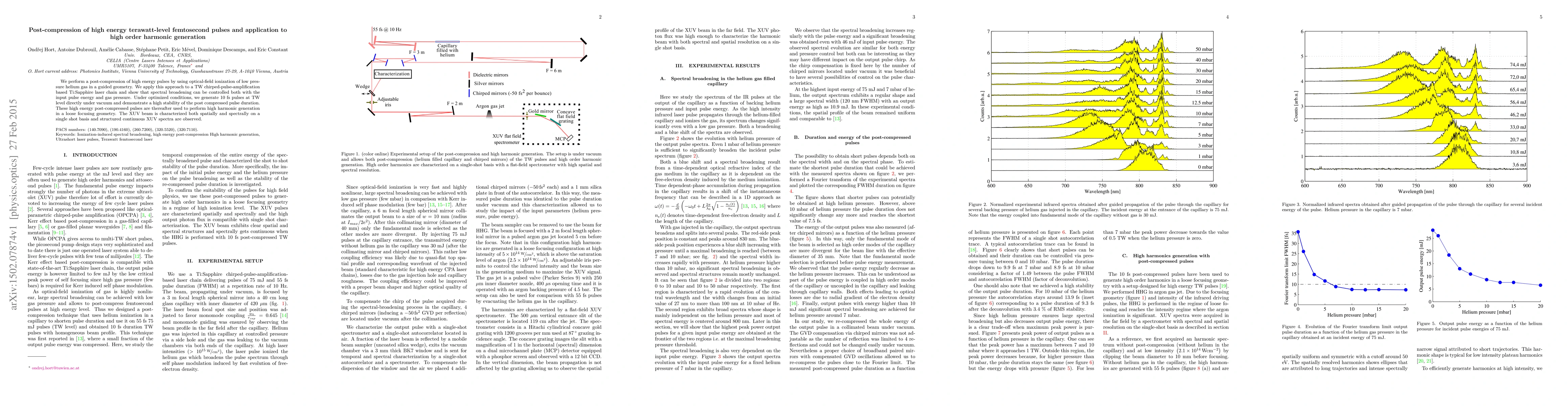 Researchers developed a method to compress high-energy pulses using optical-field ionization of helium gas, achieving 10 fs pulses at TW level under vacuum with controlled spectral broadening. The compressed pulses were then used for high-order harmonic generation, producing structured continuous XUV spectra.