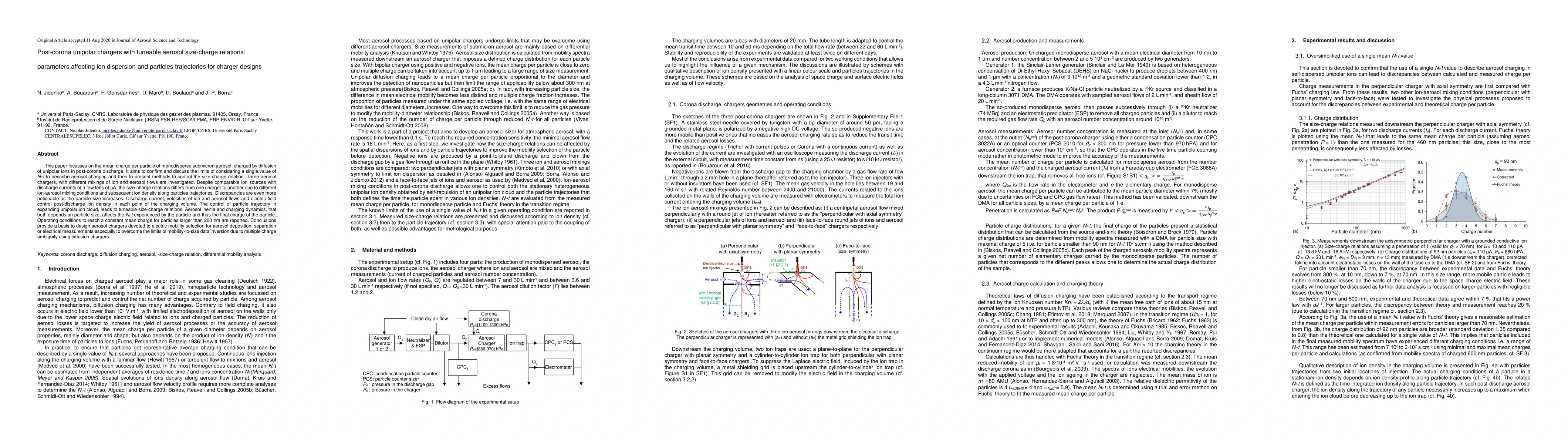 This paper focusses on the mean charge per particle of monodisperse submicron aerosol, charged by diffusion of unipolar ions in post-corona discharge. It aims to confirm and discuss the limits of considering a single value of Ni$\times$t to describe aerosol charging and then to present methods to control the size-charge relation. Three aerosol chargers, with different mixings of ion and aerosol flows are investigated. Despite comparable ion sources with discharge currents of a few tens of $\mu$A, the size-charge relations differs from one charger to another due to different ion-aerosol mixing conditions and subsequent ion density along particles trajectories. Discrepancies are even more noticeable as the particle size increases. Discharge current, velocities of ion and aerosol flows and electric field control post-discharge ion density in each point of the charging volume. The control of particle trajectory in expanding unipolar ion cloud, leads to tuneable size-charge relations. Aerosol inertia and charging dynamics, that both depends on particle size, affects the Ni$\times$t experienced by the particle and thus the final charge of the particle. Operating conditions to reach a constant mean charge for particles larger than 200 nm are reported. Conclusions provide a basis to design aerosol chargers devoted to electric mobility selection for aerosol deposition, separation or electrical measurements especially to overcome the limits of mobility-to-size data inversion due to multiple charge ambiguity using diffusion chargers.
