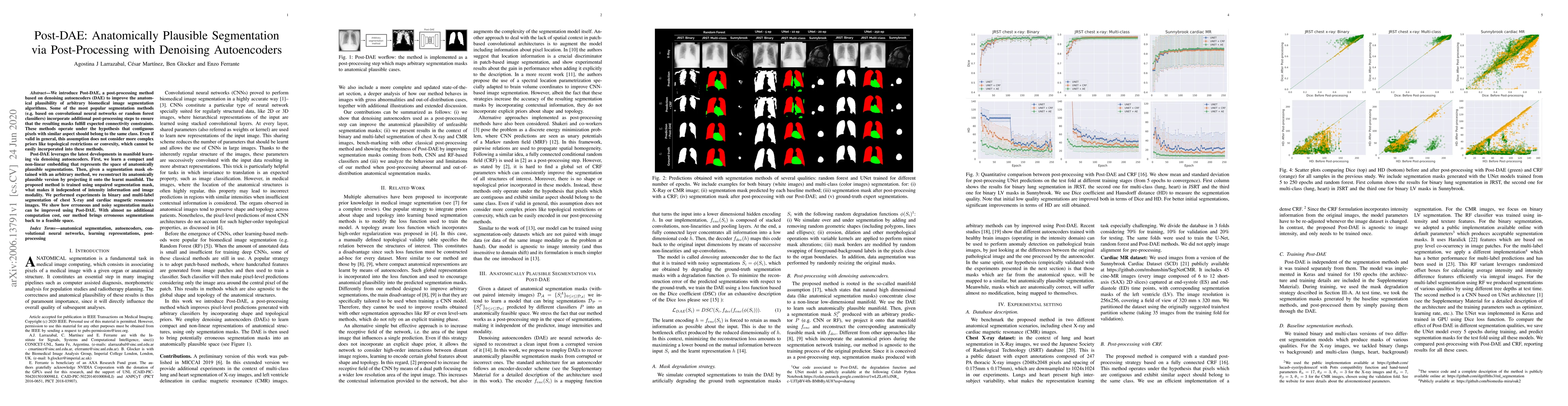 Post-DAE enhances the anatomical plausibility of biomedical image segmentations using denoising autoencoders for post-processing, projecting initial segmentations onto a learned manifold of plausible anatomical structures. Experiments on chest X-rays and cardiac MRIs demonstrate significant improvements in erroneous segmentations with minimal computational overhead.