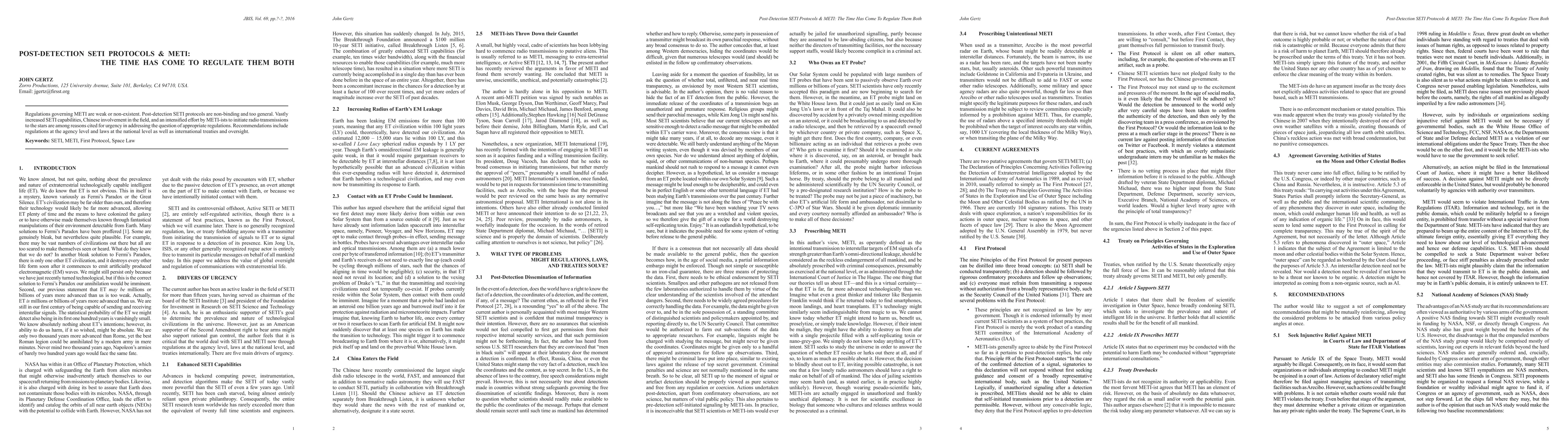 Regulations governing METI are weak or non-existent. Post-detection SETI protocols are non-binding and too general. Vastly increased SETI capabilities, Chinese involvement in the field, and an intensified effort by METI-ists to initiate radio transmissions to the stars are among reasons cited for urgency in addressing the question of appropriate regulations. Recommendations include regulations at the agency level and laws at the national level as well as international treaties and oversight.