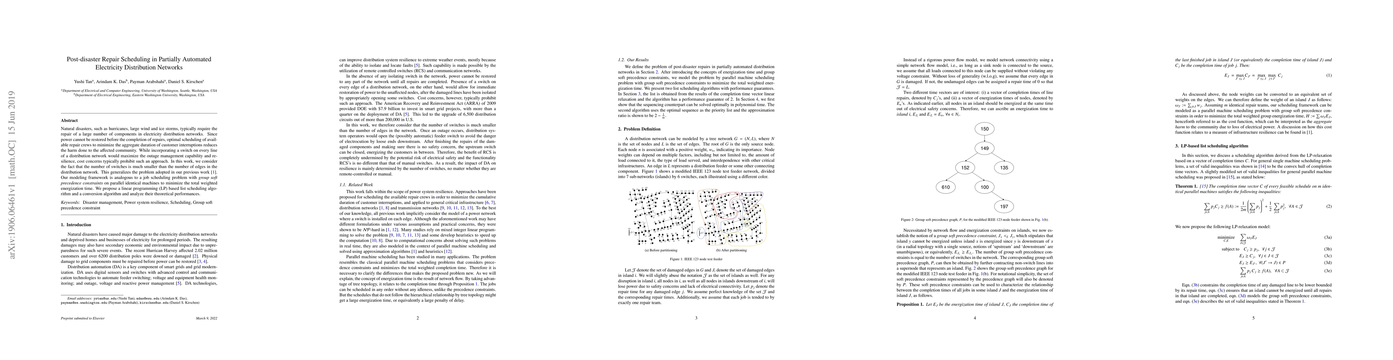 Natural disasters require repairing all damaged components in electricity distribution networks. Optimal scheduling repair crews to minimize the aggregate duration of interruptions reduces the harm. We consider the fact that the number of switches is much smaller than the number of edges. The problem is modeled by a parallel identical machine scheduling with group soft precedence constraints to minimize the total weighted energization time. We propose an LP-based list scheduling algorithm and a conversion algorithm and analyze their theoretical performances.