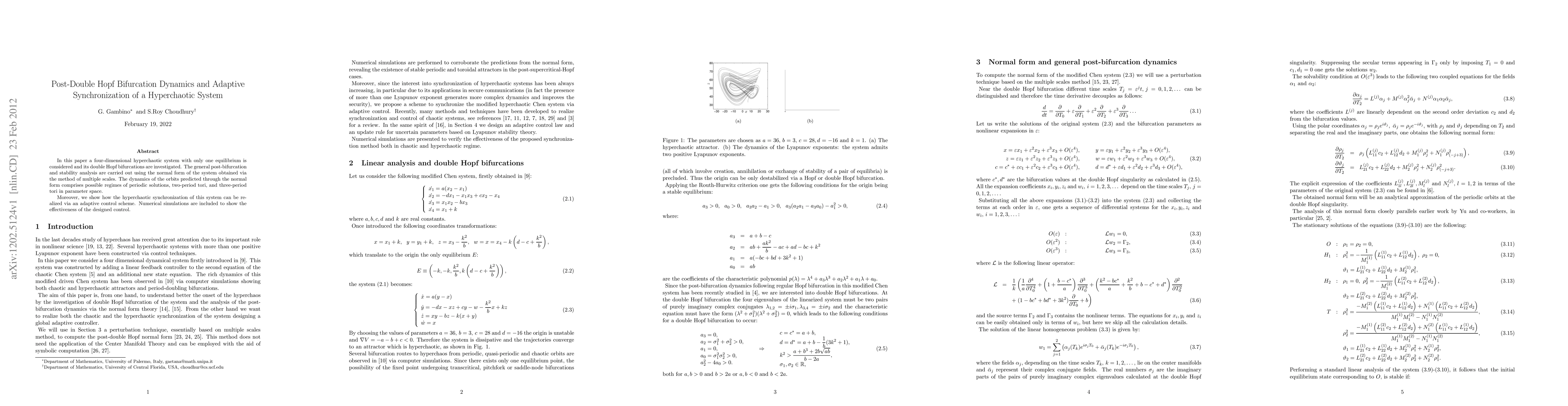 In this paper a four-dimensional hyperchaotic system with only one equilibrium is considered and its double Hopf bifurcations are investigated. The general post-bifurcation and stability analysis are carried out using the normal form of the system obtained via the method of multiple scales. The dynamics of the orbits predicted through the normal form comprises possible regimes of periodic solutions, two-period tori, and three-period tori in parameter space. Moreover, we show how the hyperchaotic synchronization of this system can be realized via an adaptive control scheme. Numerical simulations are included to show the effectiveness of the designed control.