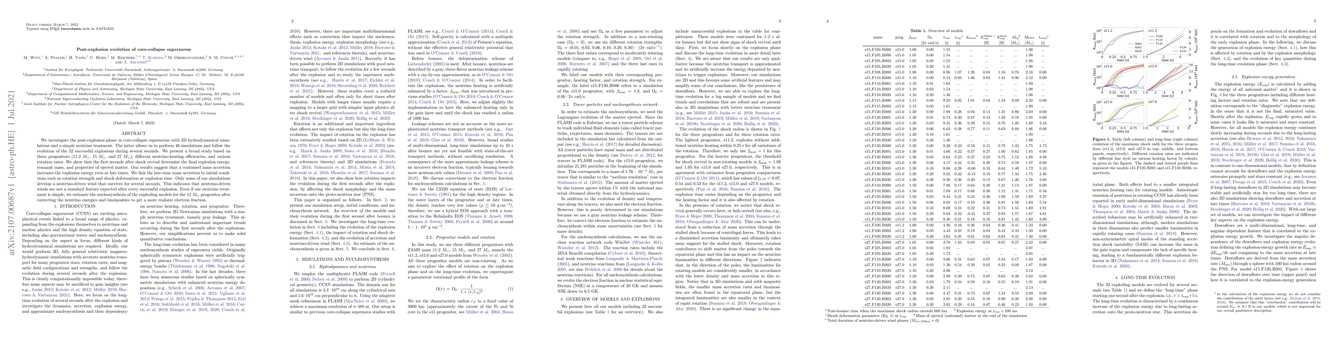 This paper uses 2D hydrodynamical simulations to study the post-explosion phase of core-collapse supernovae, focusing on the first seconds after shock revival which determine explosion energy, remnant mass, and ejected matter properties. It finds that continued mass accretion can enhance explosion energy and that neutrino-driven winds are not a universal feature post-explosion.