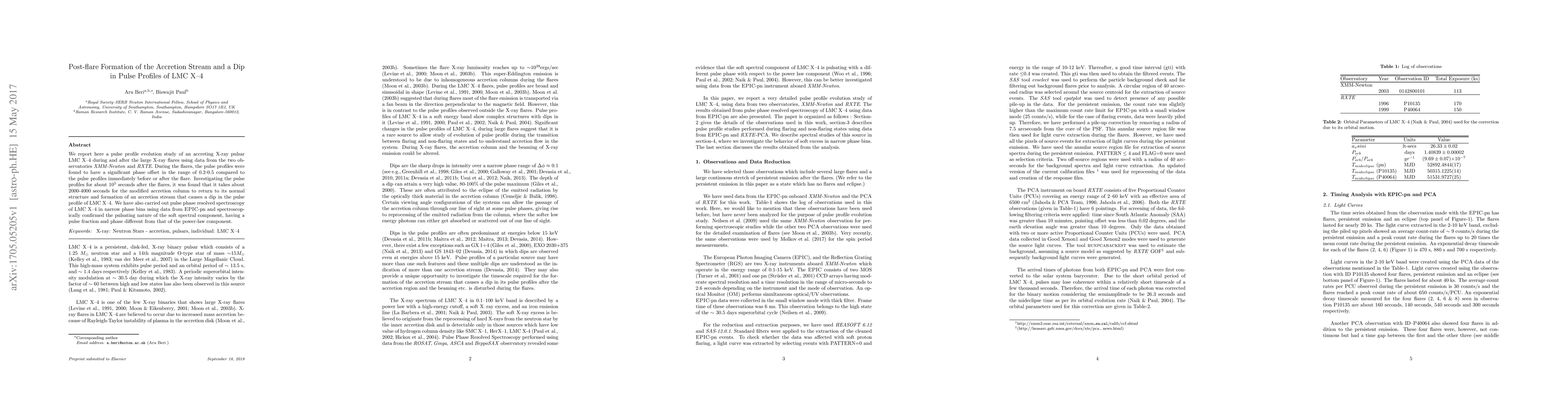 We report here a pulse profile evolution study of an accreting X-ray pulsar LMC X-4 during and after the large X-ray flares using data from the two observatories XMM-Newton and RXTE. During the flares, the pulse profiles were found to have a significant phase offset in the range of 0.2-0.5 compared to the pulse profiles immediately before or after the flare. Investigating the pulse profiles for about 10^5 seconds after the flares, it was found that it takes about 2000-4000 seconds for the modified accretion column to return to its normal structure and formation of an accretion stream that causes a dip in the pulse profile of LMC X-4. We have also carried out pulse phase resolved spectroscopy of LMC X-4 in narrow phase bins using data from EPIC-pn and spectroscopically confirmed the pulsating nature of the soft spectral component, having a pulse fraction and phase different from that of the power-law component.