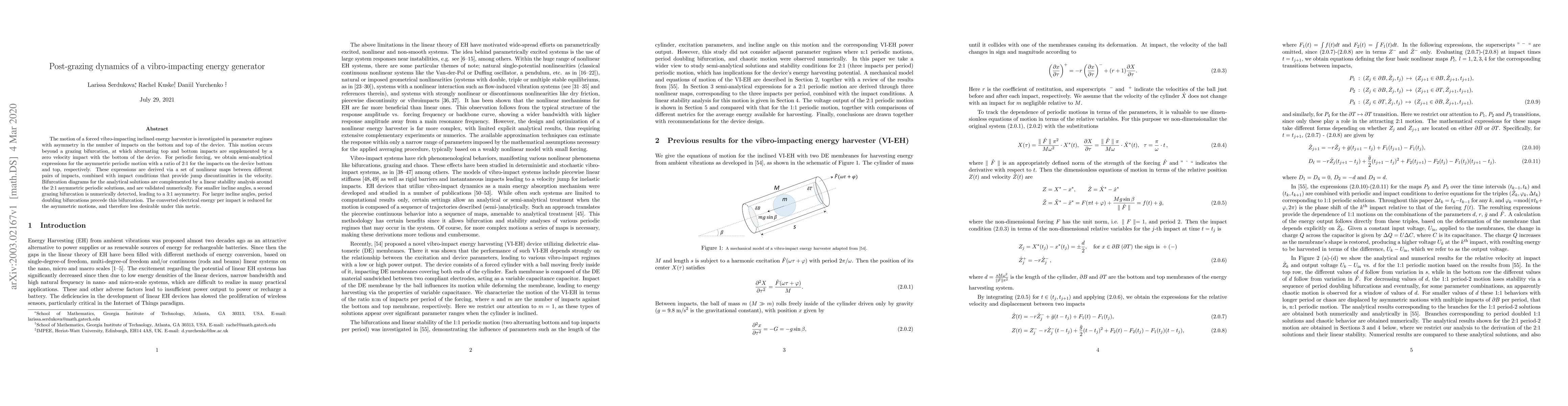 This paper investigates the dynamics of a forced vibro-impacting inclined energy harvester post-grazing bifurcation, deriving semi-analytical expressions for asymmetric periodic motion and validating them numerically. It finds that asymmetric impacts reduce converted electrical energy, making them less desirable for energy generation.