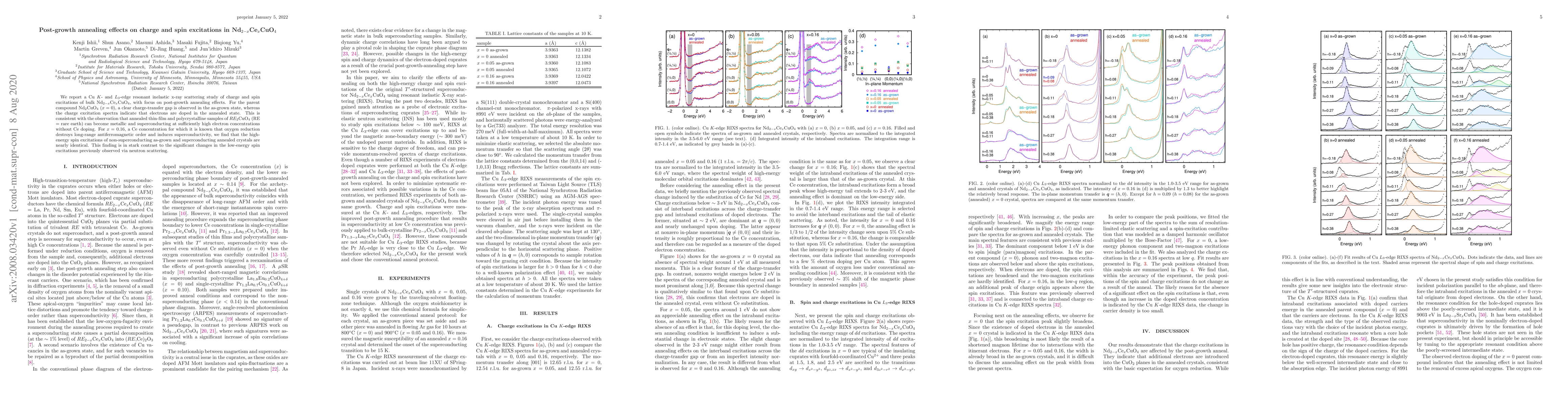 This study investigates the impact of post-growth annealing on charge and spin excitations in Nd$_{2-x}$Ce$_x$CuO$_4$ using resonant inelastic x-ray scattering. Annealing induces electron doping and metallic/superconducting behavior, while high-energy spin excitations remain nearly unchanged despite the loss of antiferromagnetic order and induction of superconductivity.
