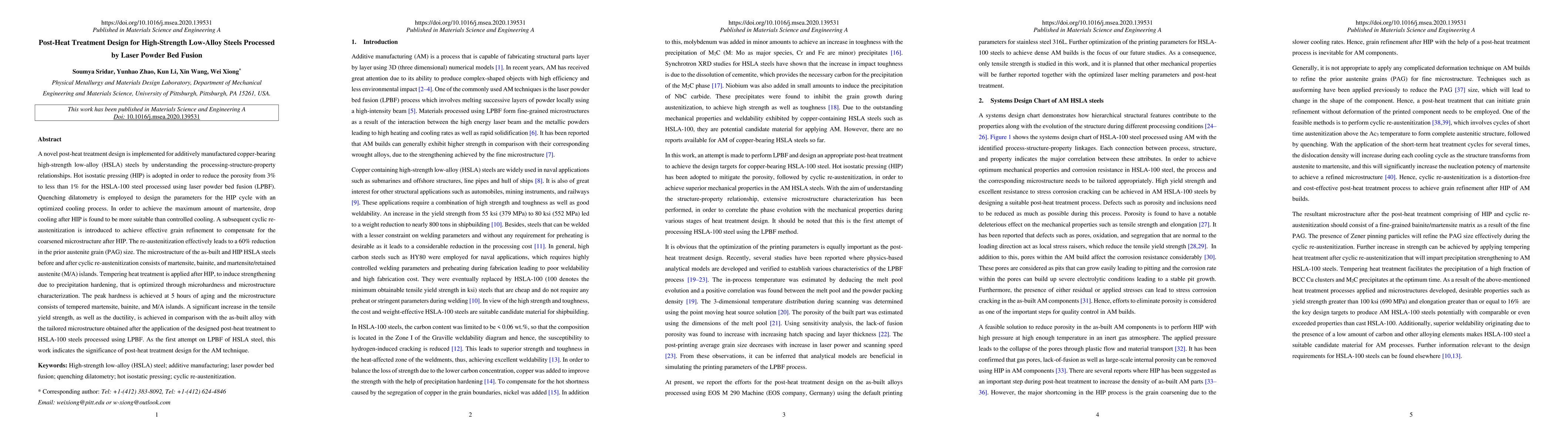 In this study, a post-heat treatment design for additively manufactured copper-bearing high-strength low-alloy (HSLA)-100 steel is performed by understanding the process-structure-property relationships. Hot isostatic pressing (HIP) is designed to reduce the porosity from 3% to less than 1% for the HSLA-100 steel processed by laser powder bed fusion (LPBF). Quenching dilatometry is employed to design the HIP parameters with the optimized cooling rate for the maximum amount of martensite transformed after HIP. Afterward, a post-heat treatment step with cyclic re-austenitization is introduced for an effective grain refinement to compensate the coarsened microstructure after HIP. Finally, tempering is optimized through microstructure characterization and microhardness. A two-fold increase in the yield strength of the HSLA with tailored microstructure during post-heat treatment is achieved in comparison with the as-built HSLA.