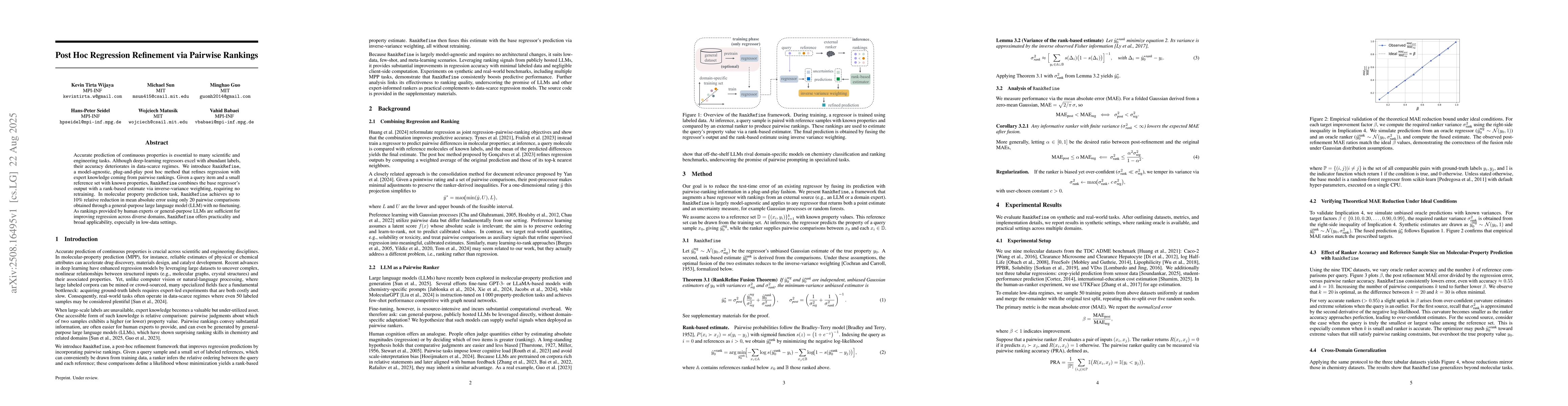 Accurate prediction of continuous properties is essential to many scientific and engineering tasks. Although deep-learning regressors excel with abundant labels, their accuracy deteriorates in data-scarce regimes. We introduce RankRefine, a model-agnostic, plug-and-play post hoc method that refines regression with expert knowledge coming from pairwise rankings. Given a query item and a small reference set with known properties, RankRefine combines the base regressor's output with a rank-based estimate via inverse variance weighting, requiring no retraining. In molecular property prediction task, RankRefine achieves up to 10% relative reduction in mean absolute error using only 20 pairwise comparisons obtained through a general-purpose large language model (LLM) with no finetuning. As rankings provided by human experts or general-purpose LLMs are sufficient for improving regression across diverse domains, RankRefine offers practicality and broad applicability, especially in low-data settings.
