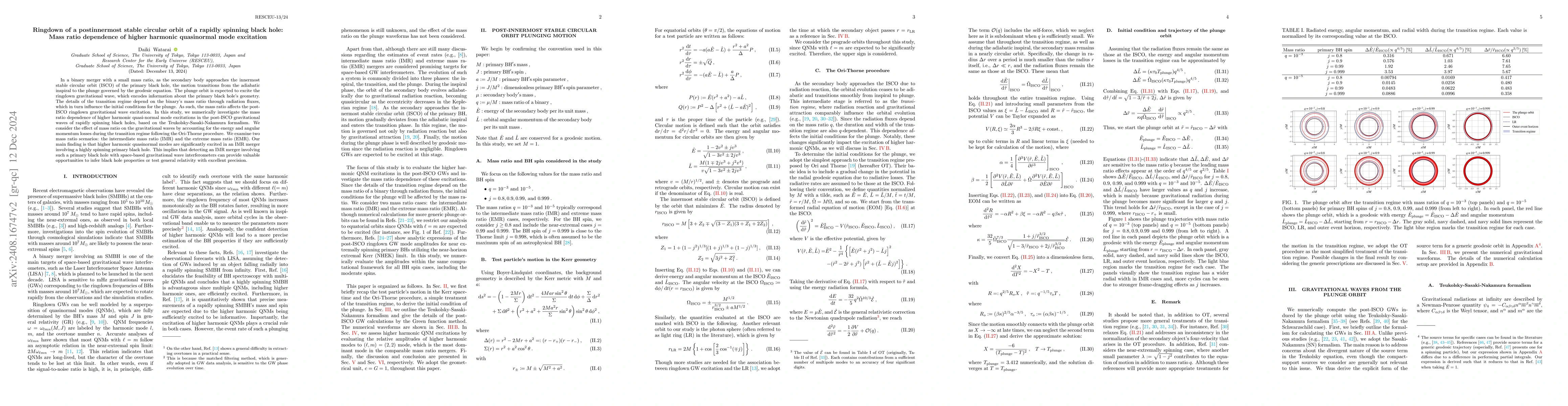 This study numerically explores how the mass ratio in a binary merger affects the excitation of higher harmonic quasi-normal modes in the gravitational waves emitted during the post-innermost stable circular orbit (ISCO) ringdown phase of rapidly spinning black holes. The results show that intermediate mass ratio mergers involving highly spinning primary black holes significantly excite higher harmonics, providing precise opportunities for inferring black hole properties or testing general relativity.