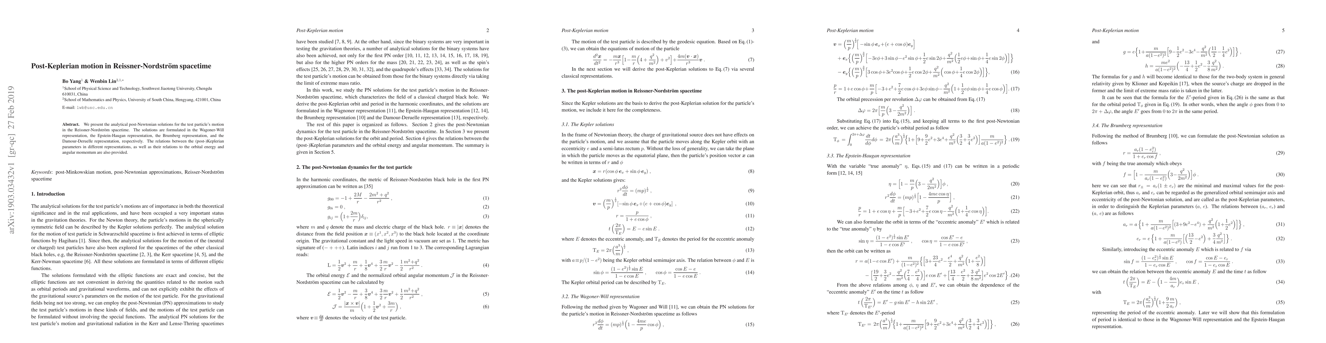 This paper provides analytical post-Newtonian solutions for test particle motion in Reissner-Nordström spacetime, formulated in four different representations, and discusses the relationships between (post-)Keplerian parameters and orbital energy/angular momentum.