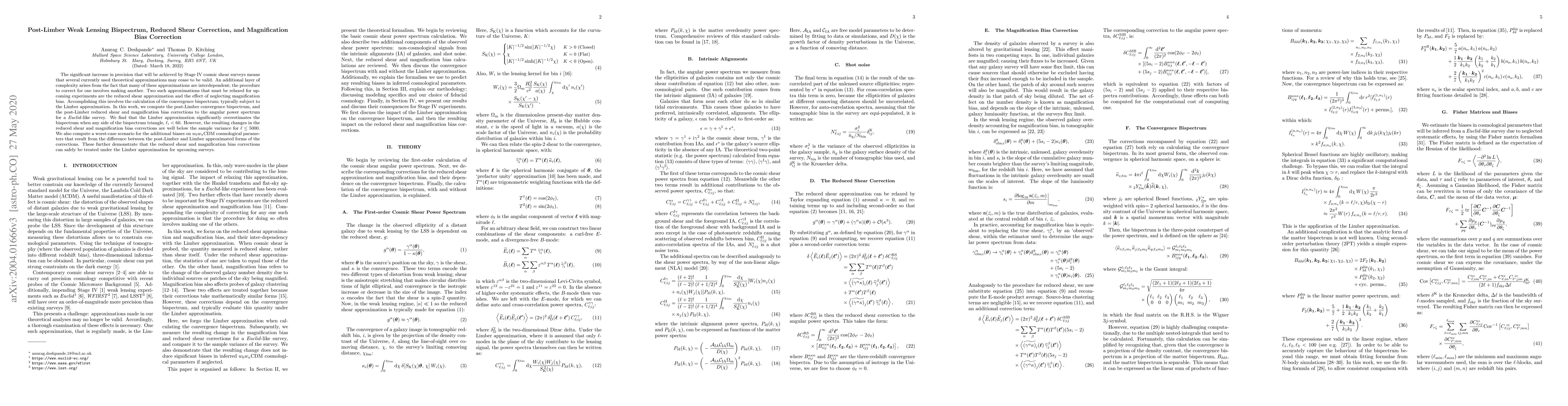 The significant increase in precision that will be achieved by Stage IV cosmic shear surveys means that several currently used theoretical approximations may cease to be valid. An additional layer of complexity arises from the fact that many of these approximations are interdependent; the procedure to correct for one involves making another. Two such approximations that must be relaxed for upcoming experiments are the reduced shear approximation and the effect of neglecting magnification bias. Accomplishing this involves the calculation of the convergence bispectrum; typically subject to the Limber approximation. In this work, we compute the post-Limber convergence bispectrum, and the post-Limber reduced shear and magnification bias corrections to the angular power spectrum for a Euclid-like survey. We find that the Limber approximation significantly overestimates the bispectrum when any side of the bispectrum triangle, $\ell_i<60$. However, the resulting changes in the reduced shear and magnification bias corrections are well below the sample variance for $\ell\leq5000$. We also compute a worst-case scenario for the additional biases on $w_0w_a$CDM cosmological parameters that result from the difference between the post-Limber and Limber approximated forms of the corrections. These further demonstrate that the reduced shear and magnification bias corrections can safely be treated under the Limber approximation for upcoming surveys.